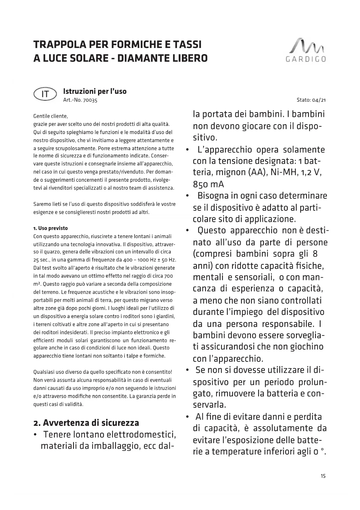 Con questo apparecchio, riuscirete a tenere lontani i animali utilizzando una tecnologia innovativa. Il dispositivo, attraver- so il quarzo, genera delle vibrazioni con un intervallo di circa 25 sec., in una gamma di frequenze da 400 – 1000 Hz ± 50 Hz. Dal test svolto all‘aperto è risultato che le vibrazioni generate in tal modo avevano un ottimo effetto nel raggio di circa 700 m². Questo raggio può variare a seconda della composizione del terreno. Le frequenze acustiche e le vibrazioni sono insop- portabili per molti animali di terra, per questo migrano verso altre zone già dopo pochi giorni. I luoghi ideali per l‘utilizzo di un dispositivo a energia solare contro i roditori sono i giardini, i terreni coltivati e altre zone all‘aperto in cui si presentano dei roditori indesiderati. Il preciso impianto elettronico e gli efficienti moduli solari garantiscono un funzionamento re- golare anche in caso di condizioni di luce non ideali. Questo apparecchio tiene lontani non soltanto i talpe e formiche. Qualsiasi uso diverso da quello specificato non è consentito! Non verrà assunta alcuna responsabilità in caso di eventuali danni causati da uso improprio e/o non seguendo le istruzioni e/o attraverso modifiche non consentite. La garanzia perde in questi casi di validità.