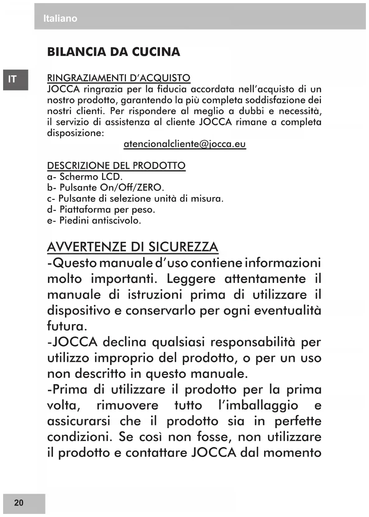 -Questo manuale d’uso contiene informazioni molto importanti. Leggere attentamente il manuale di istruzioni prima di utilizzare il dispositivo e conservarlo per ogni eventualità futura. -JOCCA declina qualsiasi responsabilità per utilizzo improprio del prodotto, o per un uso non descritto in questo manuale. -Prima di utilizzare il prodotto per la prima volta, rimuovere tutto l’imballaggio e assicurarsi che il prodotto sia in perfette condizioni. Se così non fosse, non utilizzare il prodotto e contattare JOCCA dal momentoIT Italiano