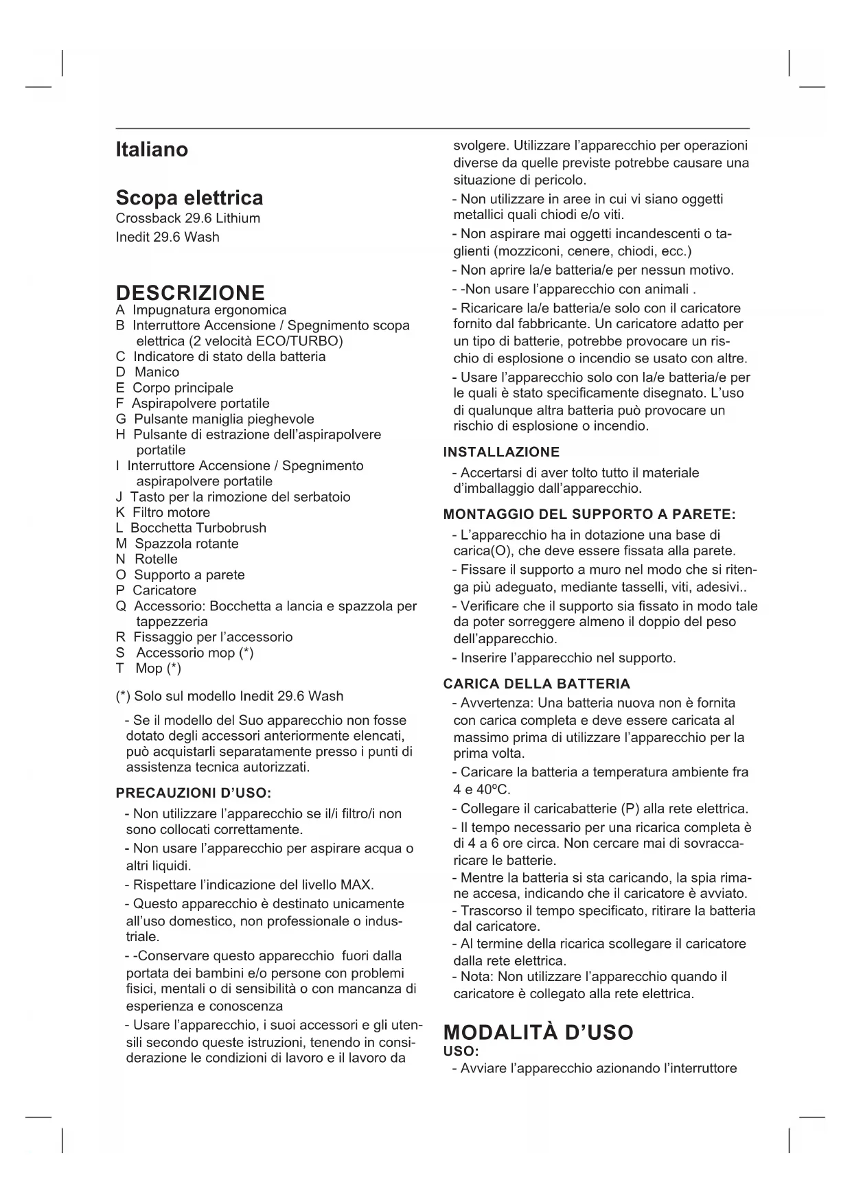 VERFAHREN SIE WIE FOLGT: - Die vordere Zierleiste herausnehmen (Fig.8) - Die 6 Schrauben entfernen, die die beiden Teile des Handstaubsaugers zusammenhalten, um zum Inneren zu gelangen. (Fig.8) - Die Verbindungen lösen und die 3 Schrauben entfernen, die die Batterie mit dem Motor ver- binden. (Fig.8) - Nun können Sie ohne Gefahr die Batterie aus dem Fach nehmen. Dieses Gerät erfüllt die Richtlinie 2014/35/EU über Niederspannung, die Richtlinie 2014/30/ EU über elektromagnetische Verträglichkeit, die Richtlinie 2011/65/EU zur Beschränkung der Verwendung bestimmter gefährlicher Stoe in Elektro- und Elektronikgeräten und die Richtlinie 2009/125/EC über die Anforderungen an die umweltgerechte Gestaltung energiebetriebener Produkte.Italiano Scopa elettrica Crossback 29.6 Lithium Inedit 29.6 Wash DESCRIZIONE A Impugnatura ergonomica B Interruttore Accensione / Spegnimento scopa elettrica (2 velocità ECO/TURBO) C Indicatore di stato della batteria D Manico E Corpo principale F Aspirapolvere portatile G Pulsante maniglia pieghevole H Pulsante di estrazione dell’aspirapolvere portatile I Interruttore Accensione / Spegnimento aspirapolvere portatile J Tasto per la rimozione del serbatoio K Filtro motore L Bocchetta Turbobrush M Spazzola rotante N Rotelle O Supporto a parete P Caricatore Q Accessorio: Bocchetta a lancia e spazzola per tappezzeria R Fissaggio per l’accessorio S Accessorio mop (*) T Mop (*) (*) Solo sul modello Inedit 29.6 Wash - Se il modello del Suo apparecchio non fosse dotato degli accessori anteriormente elencati, può acquistarli separatamente presso i punti di assistenza tecnica autorizzati. PRECAUZIONI D’USO: - Non utilizzare l’apparecchio se il/i ltro/i non sono collocati correttamente. - Non usare l’apparecchio per aspirare acqua o altri liquidi. - Rispettare l’indicazione del livello MAX. - Questo apparecchio è destinato unicamente all’uso domestico, non professionale o indus- triale. - -Conservare questo apparecchio fuori dalla portata dei bambini e/o persone con problemi sici, mentali o di sensibilità o con mancanza di esperienza e conoscenza - Usare l’apparecchio, i suoi accessori e gli uten- sili secondo queste istruzioni, tenendo in consi- derazione le condizioni di lavoro e il lavoro da svolgere. Utilizzare l’apparecchio per operazioni diverse da quelle previste potrebbe causare una situazione di pericolo. - Non utilizzare in aree in cui vi siano oggetti metallici quali chiodi e/o viti. - Non aspirare mai oggetti incandescenti o ta- glienti (mozziconi, cenere, chiodi, ecc.) - Non aprire la/e batteria/e per nessun motivo. - -Non usare l’apparecchio con animali . - Ricaricare la/e batteria/e solo con il caricatore fornito dal fabbricante. Un caricatore adatto per un tipo di batterie, potrebbe provocare un ris- chio di esplosione o incendio se usato con altre. - Usare l’apparecchio solo con la/e batteria/e per le quali è stato specicamente disegnato. L’uso di qualunque altra batteria può provocare un rischio di esplosione o incendio. INSTALLAZIONE - Accertarsi di aver tolto tutto il materiale d’imballaggio dall’apparecchio. MONTAGGIO DEL SUPPORTO A PARETE: - L’apparecchio ha in dotazione una base di carica(O), che deve essere ssata alla parete. - Fissare il supporto a muro nel modo che si riten- ga più adeguato, mediante tasselli, viti, adesivi.. - Vericare che il supporto sia ssato in modo tale da poter sorreggere almeno il doppio del peso dell’apparecchio. - Inserire l’apparecchio nel supporto.
