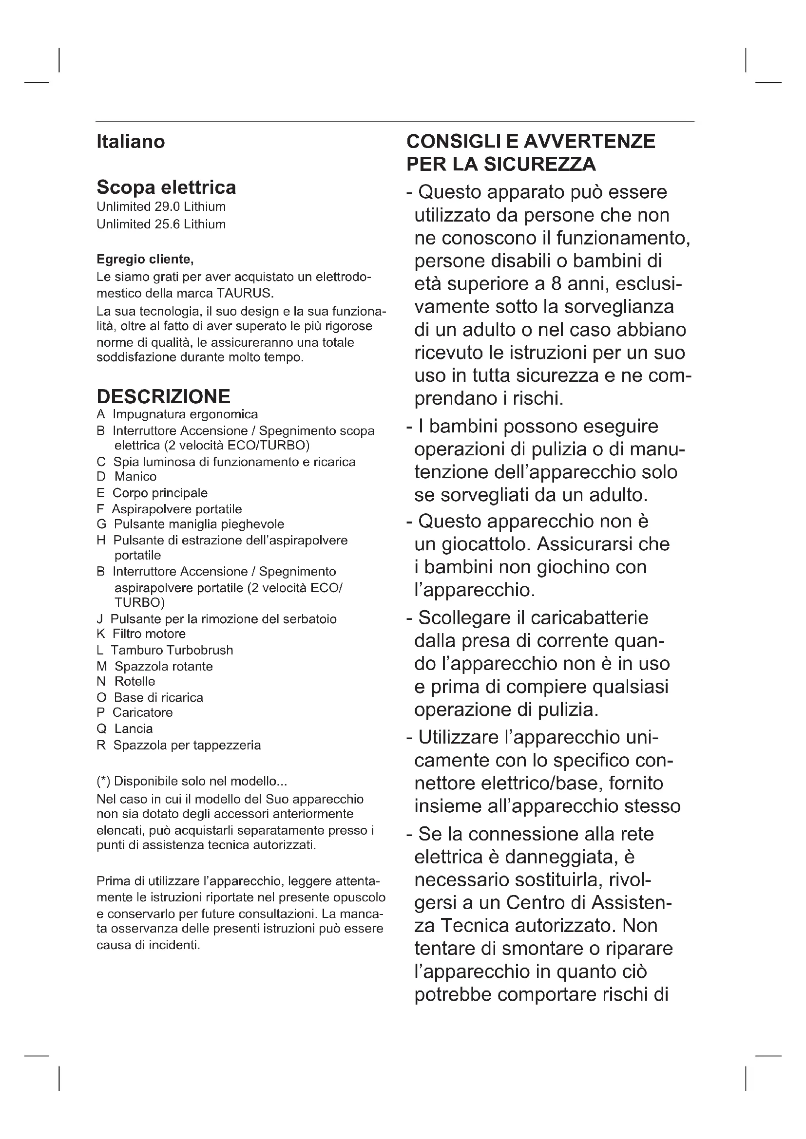 Unlimited 25.6 Lithium - Aspirapolvere TAURUS - Manuale utente e istruzioni gratuiti