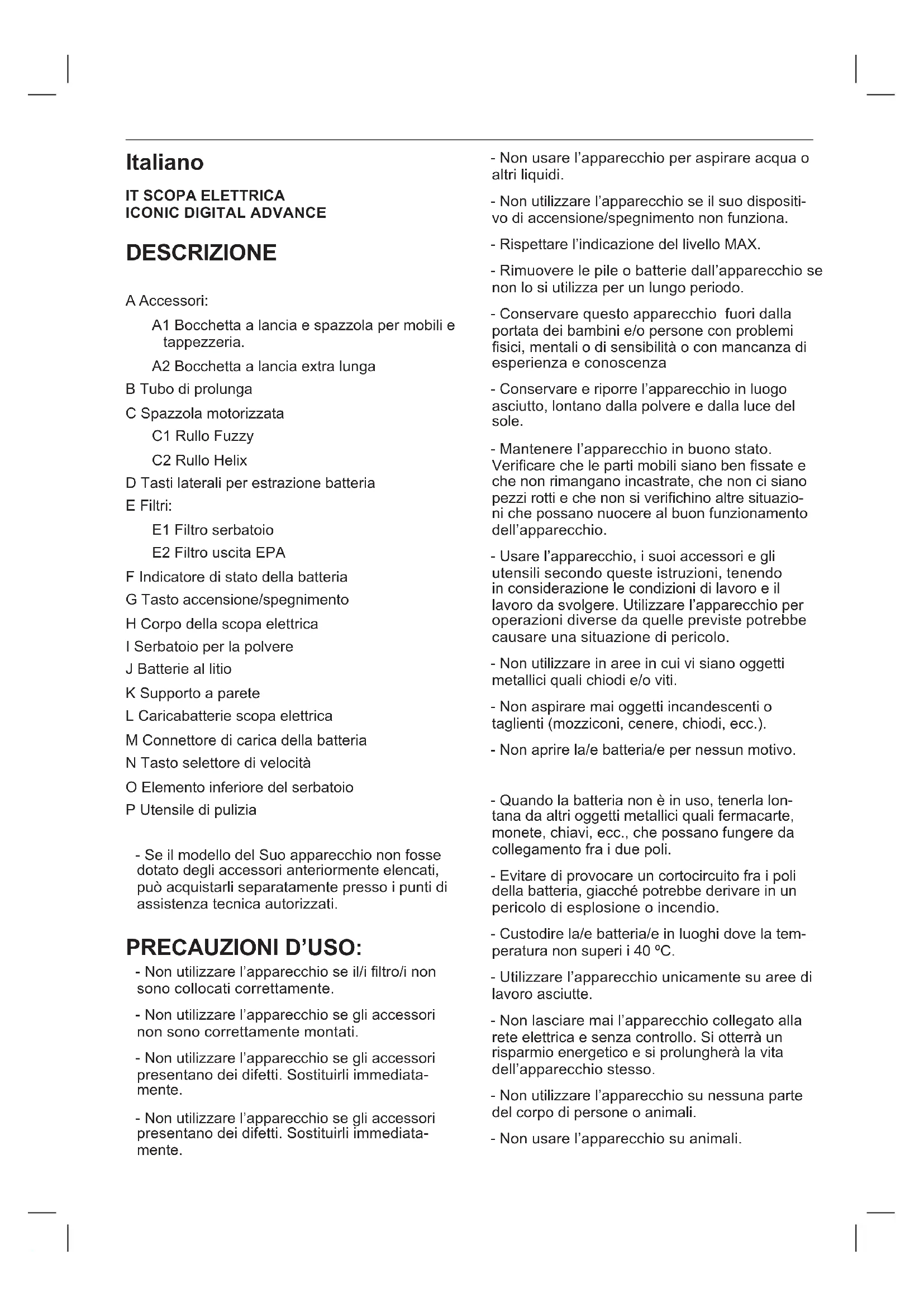 DESCRIZIONE A Accessori: A1 Bocchetta a lancia e spazzola per mobili e tappezzeria. A2 Bocchetta a lancia extra lunga B Tubo di prolunga C Spazzola motorizzata C1 Rullo Fuzzy C2 Rullo Helix D Tasti laterali per estrazione batteria E Filtri: E1 Filtro serbatoio E2 Filtro uscita EPA F Indicatore di stato della batteria G Tasto accensione/spegnimento H Corpo della scopa elettrica I Serbatoio per la polvere J Batterie al litio K Supporto a parete L Caricabatterie scopa elettrica M Connettore di carica della batteria N Tasto selettore di velocità O Elemento inferiore del serbatoio P Utensile di pulizia - Se il modello del Suo apparecchio non fosse dotato degli accessori anteriormente elencati, può acquistarli separatamente presso i punti di assistenza tecnica autorizzati. PRECAUZIONI D’USO: - Non utilizzare l’apparecchio se il/i ltro/i non sono collocati correttamente. - Non utilizzare l’apparecchio se gli accessori non sono correttamente montati. - Non utilizzare l’apparecchio se gli accessori presentano dei difetti. Sostituirli immediata- mente. - Non utilizzare l’apparecchio se gli accessori presentano dei difetti. Sostituirli immediata- mente. - Non usare l’apparecchio per aspirare acqua o altri liquidi. - Non utilizzare l’apparecchio se il suo dispositi- vo di accensione/spegnimento non funziona. - Rispettare l’indicazione del livello MAX. - Rimuovere le pile o batterie dall’apparecchio se non lo si utilizza per un lungo periodo. - Conservare questo apparecchio fuori dalla portata dei bambini e/o persone con problemi sici, mentali o di sensibilità o con mancanza di esperienza e conoscenza - Conservare e riporre l’apparecchio in luogo asciutto, lontano dalla polvere e dalla luce del sole. - Mantenere l’apparecchio in buono stato. Vericare che le parti mobili siano ben ssate e che non rimangano incastrate, che non ci siano pezzi rotti e che non si verichino altre situazio- ni che possano nuocere al buon funzionamento dell’apparecchio. - Usare l’apparecchio, i suoi accessori e gli utensili secondo queste istruzioni, tenendo in considerazione le condizioni di lavoro e il lavoro da svolgere. Utilizzare l’apparecchio per operazioni diverse da quelle previste potrebbe causare una situazione di pericolo. - Non utilizzare in aree in cui vi siano oggetti metallici quali chiodi e/o viti. - Non aspirare mai oggetti incandescenti o taglienti (mozziconi, cenere, chiodi, ecc.). - Non aprire la/e batteria/e per nessun motivo. - Quando la batteria non è in uso, tenerla lon- tana da altri oggetti metallici quali fermacarte, monete, chiavi, ecc., che possano fungere da collegamento fra i due poli. - Evitare di provocare un cortocircuito fra i poli della batteria, giacché potrebbe derivare in un pericolo di esplosione o incendio. - Custodire la/e batteria/e in luoghi dove la tem- peratura non superi i 40 ºC. - Utilizzare l’apparecchio unicamente su aree di lavoro asciutte. - Non lasciare mai l’apparecchio collegato alla rete elettrica e senza controllo. Si otterrà un risparmio energetico e si prolungherà la vita dell’apparecchio stesso. - Non utilizzare l’apparecchio su nessuna parte del corpo di persone o animali. - Non usare l’apparecchio su animali.- Se le cinque spie (F) si illuminano, signica che il livello di carica è completo. - Se si illumina solo una spia signica che la batteria dispone di poca carica. - Se non si accende alcuna spia, signica che la batteria è completamente scarica. - Nota: Per prolungare la vita della batteria, si consiglia di ricaricare la batteria solo quando è completamente scarica.