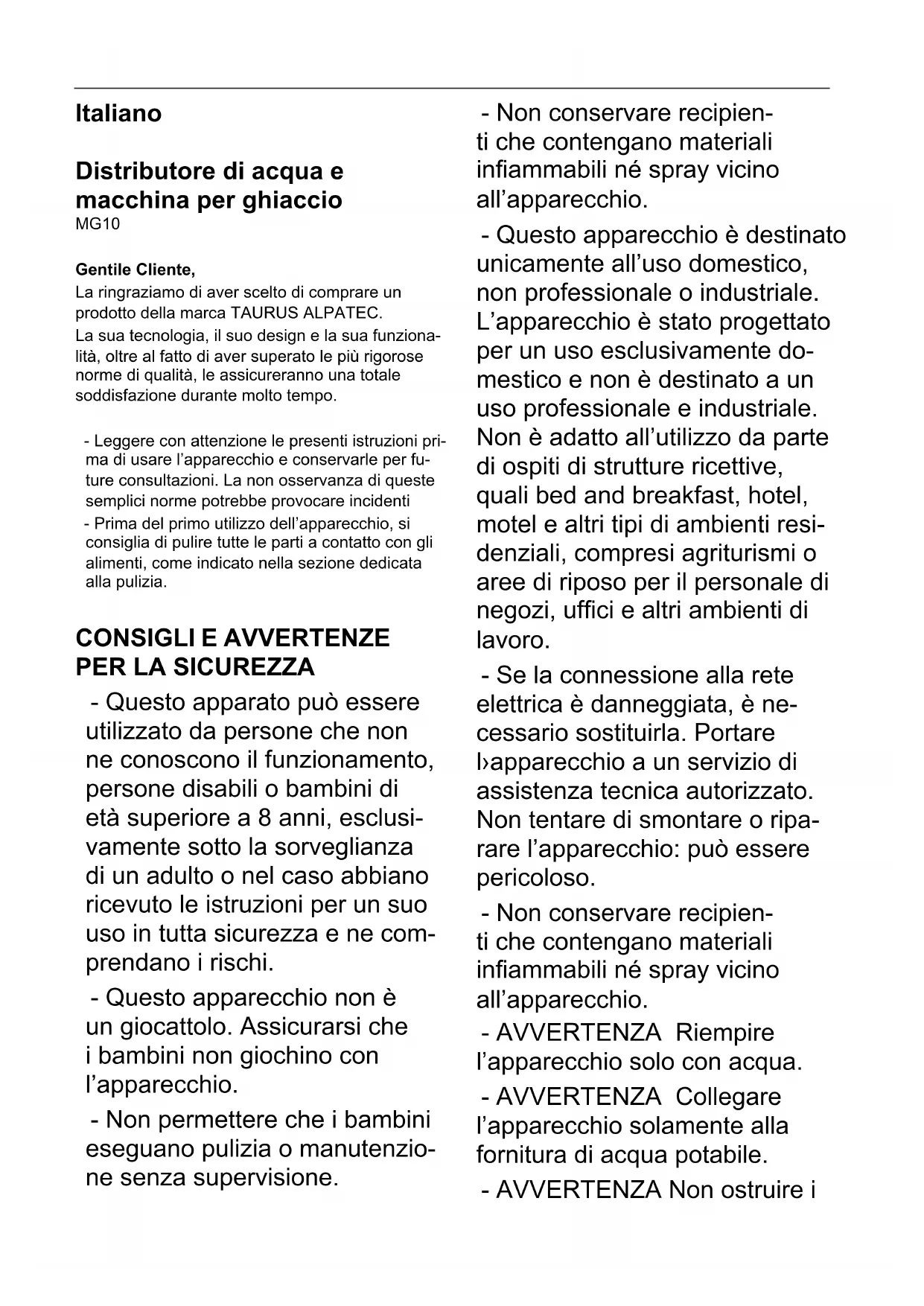 Scarica le istruzioni per il tuo Distributore d'acqua in formato PDF gratuitamente! Trova il tuo manuale MG 10 - TAURUS e riprendi in mano il tuo dispositivo elettronico. In questa pagina sono pubblicati tutti i documenti necessari per l'utilizzo del tuo dispositivo. MG 10 del marchio TAURUS.