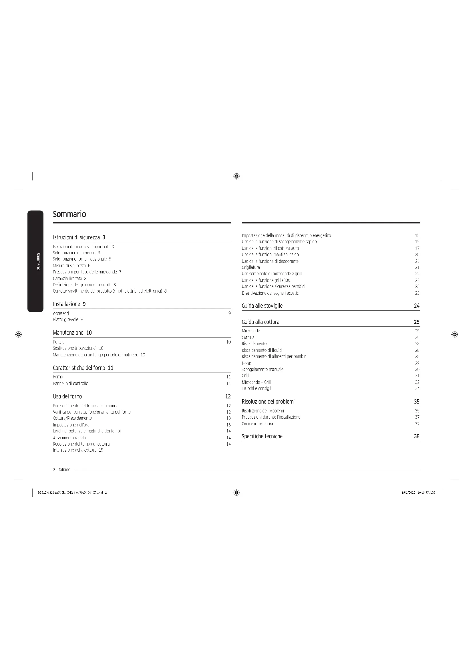 - (opłata według taryfy operatora) http://www.samsung.com/pl/support/ DE68-04704K-00 MG22M8254AK_E1_DE68-04704K-00_NL.indd 40MG22M8254AK_E1_DE68-04704K-00_NL.indd 40 15/2/2022 10:05:21 AM15/2/2022 10:05:21 AMForno a microonde Manuale dell'utente MG22M8254A*, MG22T8254A* MG22M8254AK_E1_DE68-04704K-00_IT.indd 1MG22M8254AK_E1_DE68-04704K-00_IT.indd 1 15/2/2022 10:15:37 AM15/2/2022 10:15:37 AM2 Italiano Sommario Sommario Istruzioni di sicurezza 3 Istruzioni di sicurezza importanti 3 Solo funzione microonde 3 Solo funzione forno - opzionale 5 Misure di sicurezza 6 Precauzioni per l'uso delle microonde 7 Garanzia limitata 8 Denizione del gruppo di prodotti 8 Corretto smaltimento del prodotto (riuti elettrici ed elettronici) 8 Installazione 9 Accessori 9 Piatto girevole 9 Manutenzione 10 Pulizia 10 Sostituzione (riparazione) 10 Manutenzione dopo un lungo periodo di inutilizzo 10 Caratteristiche del forno 11 Forno 11 Pannello di controllo 11 Uso del forno 12 Funzionamento del forno a microonde 12 Verica del corretto funzionamento del forno 12 Cottura/Riscaldamento 13 Impostazione dell'ora 13 Livelli di potenza e modiche dei tempi 14 Avviamento rapido 14 Regolazione del tempo di cottura 14 Interruzione della cottura 15 Impostazione della modalità di risparmio energetico 15 Uso della funzione di scongelamento rapido 15 Uso delle funzioni di cottura auto 17 Uso delle funzioni mantieni caldo 20 Uso della funzione di deodorante 21 Grigliatura 21 Uso combinato di microonde e grill 22 Uso della funzione grill+30s 22 Uso della funzione sicurezza bambini 23 Disattivazione dei segnali acustici 23 Guida alle stoviglie 24 Guida alla cottura 25 Microonde 25 Cottura 25 Riscaldamento 28 Riscaldamento di liquidi 28 Riscaldamento di alimenti per bambini 28 Nota: 29 Scongelamento manuale 30 Grill 31 Microonde + Grill 32 Trucchi e consigli 34 Risoluzione dei problemi 35 Risoluzione dei problemi 35 Precauzioni durante l'installazione 37 Codice informativo 37 Speciche tecniche 38 MG22M8254AK_E1_DE68-04704K-00_IT.indd 2MG22M8254AK_E1_DE68-04704K-00_IT.indd 2 15/2/2022 10:15:37 AM15/2/2022 10:15:37 AMItaliano 3 Istruzioni di sicurezza