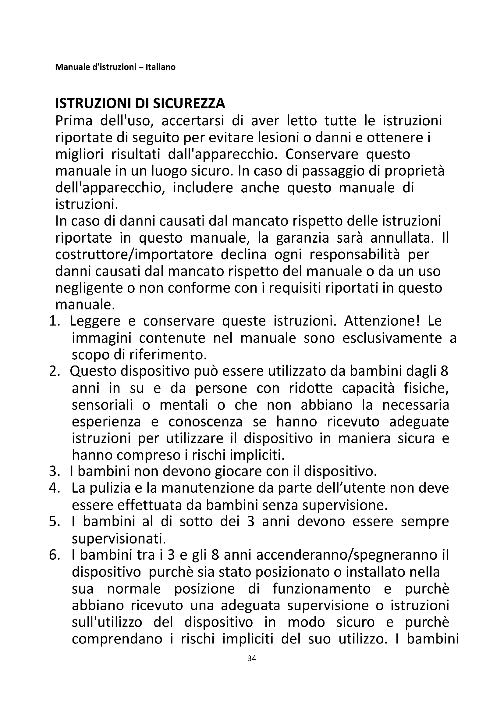 Prima dell'uso, accertarsi di aver letto tutte le istruzioni riportate di seguito per evitare lesioni o danni e ottenere i migliori risultati dall'apparecchio. Conservare questo manuale in un luogo sicuro. In caso di passaggio di proprietà dell'apparecchio, includere anche questo manuale di istruzioni. In caso di danni causati dal mancato rispetto delle istruzioni riportate in questo manuale, la garanzia sarà annullata. Il costruttore/importatore declina ogni responsabilità per danni causati dal mancato rispetto del manuale o da un uso negligente o non conforme con i requisiti riportati in questo manuale.