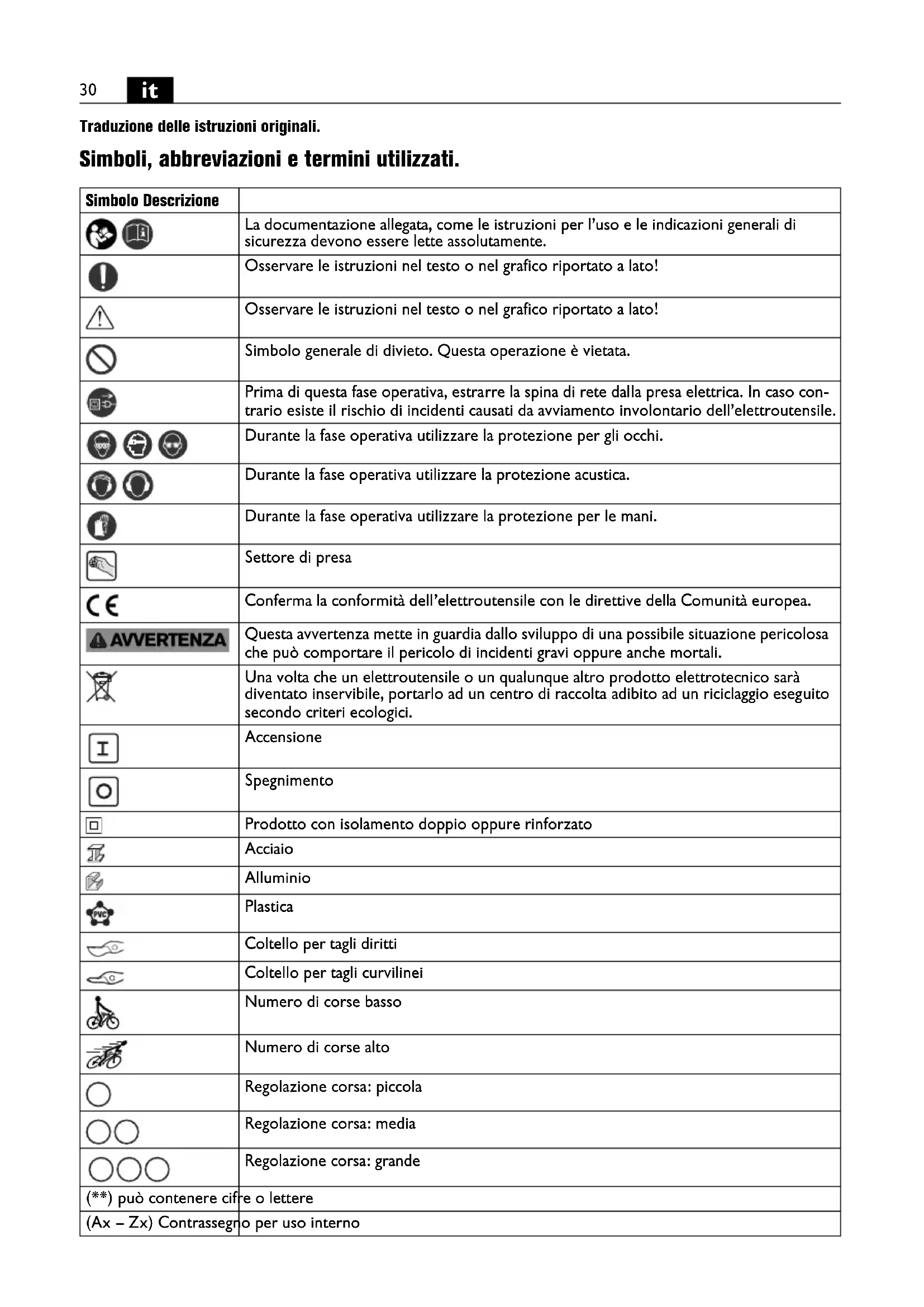 Traduzione delle istruzioni originali. Simboli, abbreviazioni e termini utilizzati. Simbolo Descrizione La documentazione allegata, come le istruzioni per l’uso e le indicazioni generali di sicurezza devono essere lette assolutamente. Osservare le istruzioni nel testo o nel grafico riportato a lato! Osservare le istruzioni nel testo o nel grafico riportato a lato! Simbolo generale di divieto. Questa operazione è vietata. Prima di questa fase operativa, estrarre la spina di rete dalla presa elettrica. In caso con- trario esiste il rischio di incidenti causati da avviamento involontario dell’elettroutensile. Durante la fase operativa utilizzare la protezione per gli occhi. Durante la fase operativa utilizzare la protezione acustica. Durante la fase operativa utilizzare la protezione per le mani. Settore di presa Conferma la conformità dell’elettroutensile con le direttive della Comunità europea. Questa avvertenza mette in guardia dallo sviluppo di una possibile situazione pericolosa che può comportare il pericolo di incidenti gravi oppure anche mortali. Una volta che un elettroutensile o un qualunque altro prodotto elettrotecnico sarà diventato inservibile, portarlo ad un centro di raccolta adibito ad un riciclaggio eseguito secondo criteri ecologici. Accensione Spegnimento Prodotto con isolamento doppio oppure rinforzato Acciaio Alluminio Plastica Coltello per tagli diritti Coltello per tagli curvilinei Numero di corse basso Numero di corse alto Regolazione corsa: piccola Regolazione corsa: media Regolazione corsa: grande (**) può contenere cifre o lettere (Ax – Zx) Contrassegno per uso interno31