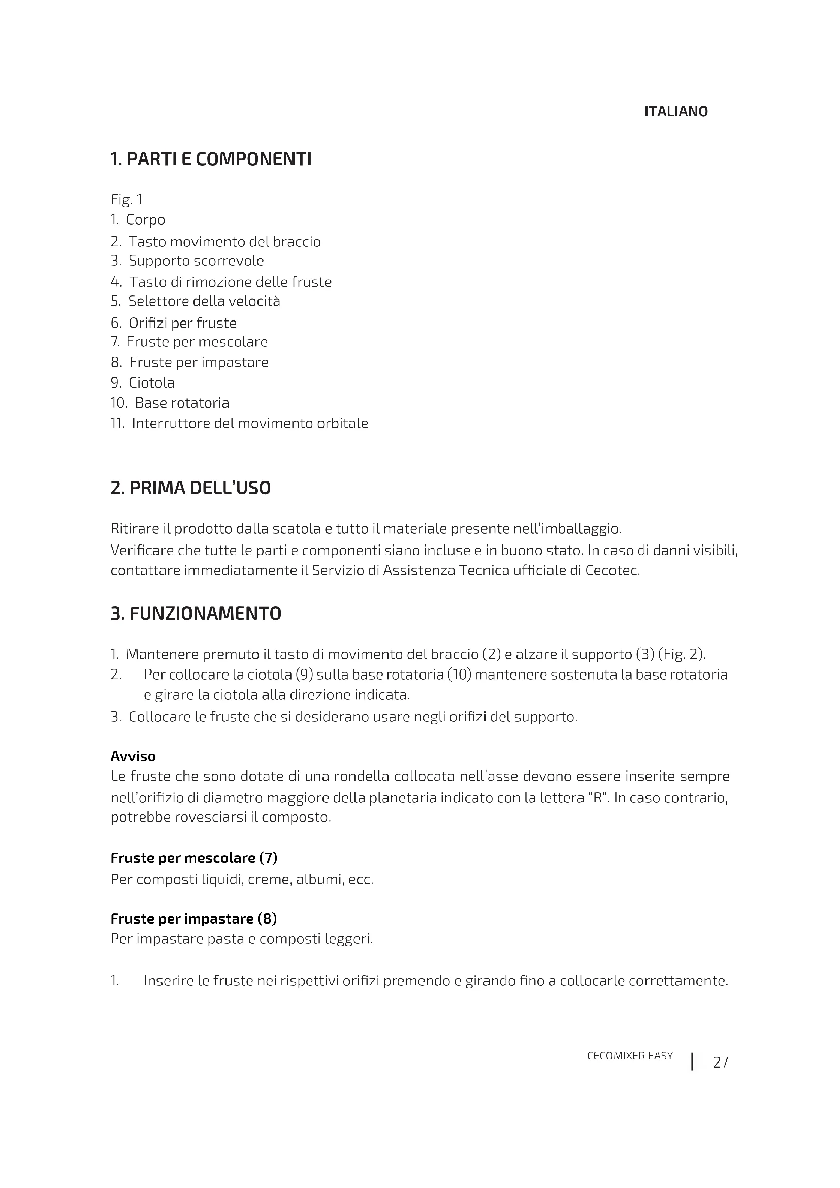 1. Inserire le fruste nei rispettivi orizi premendo e girando no a collocarle correttamente.CECOMIXER EASY