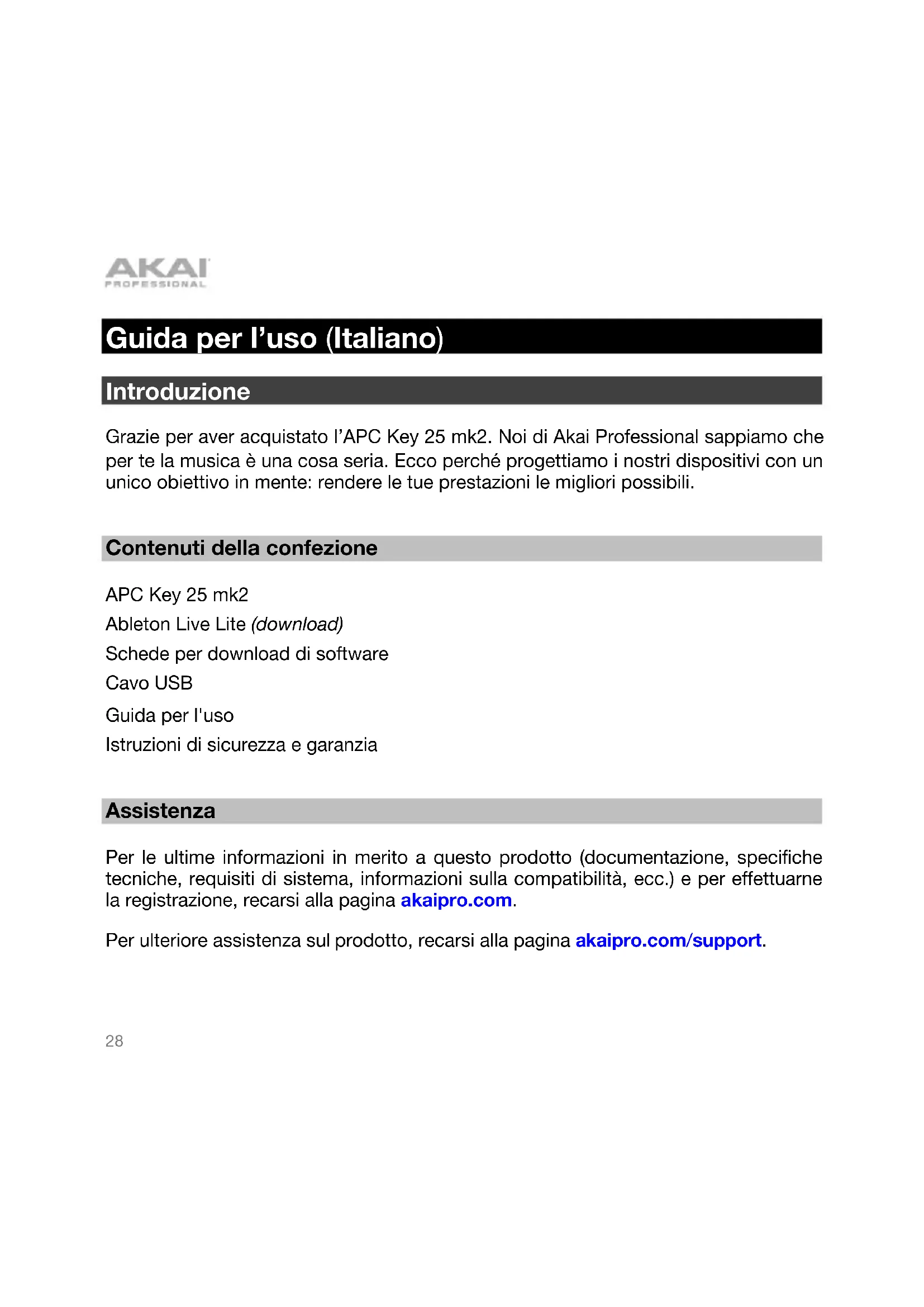 Contenuti della confezione APC Key 25 mk2 Ableton Live Lite (download) Schede per download di software Cavo USB Guida per l'uso Istruzioni di sicurezza e garanzia