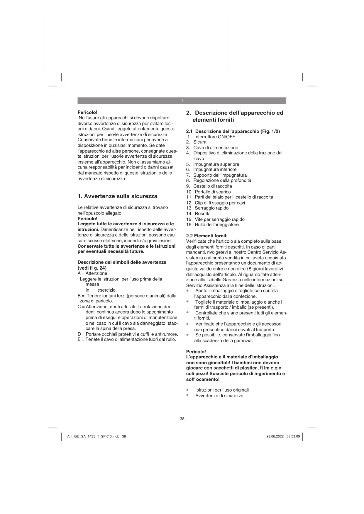 Collegate il cavo di collegamento dell’apparecchio al connettore (Figura 17 / pos. A) e assicurate il cavo di collegamento con il dispositivo di eliminazione della trazione (Fig. 17 / pos. 4). Per evitare un’accensione inavvertita dell’apparecchio, l’impugnatura (Fig. 18/Pos. 5) è dotata di un blocco dell’avviamento (Fig. 18/ Pos. 2) che deve essere premuto prima di poter attivare la leva di commutazione (Fig. 18 /Pos 1). Mollando la leva di commutazione l’apparecchio si spegne. Eseguite quest’operazione più volte per assi- curarvi che l’apparecchio funzioni correttamente. Prima di eseguire riparazioni o lavori di manuten- zione sull’apparecchio dovete assicurarvi che il cilindro con le lame sia fermo e che l’apparecchio sia scollegato dalla rete elettrica. Pericolo! Non aprite mai il portello di scarico mentre il motore è ancora acceso. Il cilindro rotante con le lame può causare lesioni. Fissate sempre bene il portello di scarico. Medi- ante la molla di trazione esso ritorna nella posizi- one “chiusa”. Deve venire sempre mantenuta la distanza di si- curezza, data dall’impugnatura di guida, tra il rive- stimento esterno e l’utilizzatore. Nello scarifi care il manto erboso e cambiare il senso di direzione su pendio si deve essere particolarmente attenti. Accertatevi di essere in posizione sicura, portate scarpe con suole antisdrucciolevoli e pantaloni lunghi. Scarifi cate sempre in senso trasversale rispetto al pendio. Per motivi di sicurezza non usate lo scarifi catore per pendii con un’inclinazione superiore ai 15 gradi. Siate particolarmente attenti muovendovi all’indietro e tirando lo scarifi catore, pericolo di inciampare! Avvertenze per lavorare in modo corretto Nel lavorare si consiglia di ripassare i margini della fascia già eseguita, quindi con una sovrap- posizione. Per ottenere un taglio preciso si deve muovere l’apparecchio in fasce possibilmente diritte. Le corsie formate eseguendo l’operazione si devono quindi sovrapporre sempre di alcuni centimetri al Anl_GE_SA_1435_1_SPK13.indb 41Anl_GE_SA_1435_1_SPK13.indb 41 28.06.2022 08:53:1028.06.2022 08:53:10I