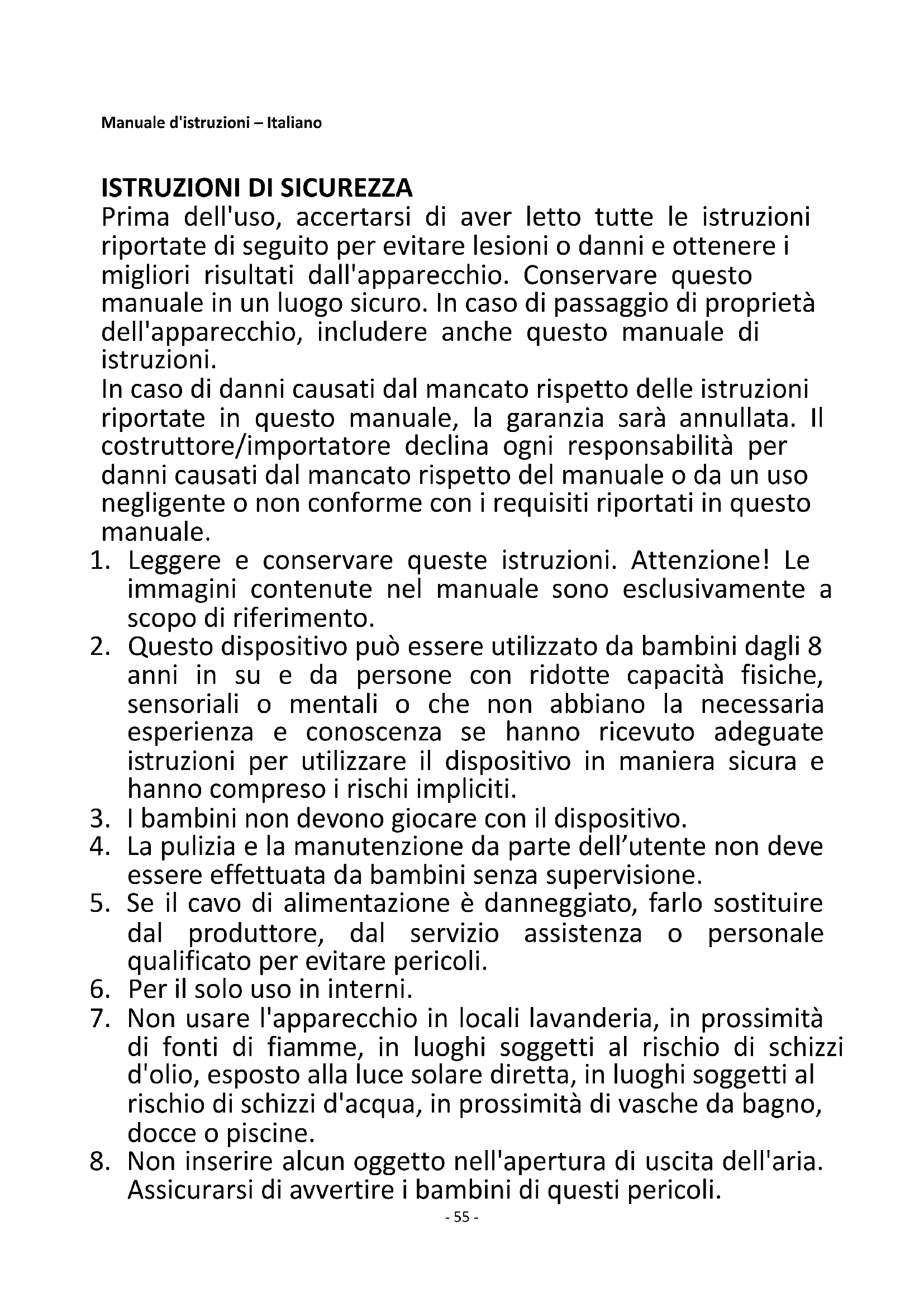 Prima dell'uso, accertarsi di aver letto tutte le istruzioni riportate di seguito per evitare lesioni o danni e ottenere i migliori risultati dall'apparecchio. Conservare questo manuale in un luogo sicuro. In caso di passaggio di proprietà dell'apparecchio, includere anche questo manuale di istruzioni. In caso di danni causati dal mancato rispetto delle istruzioni riportate in questo manuale, la garanzia sarà annullata. Il costruttore/importatore declina ogni responsabilità per danni causati dal mancato rispetto del manuale o da un uso negligente o non conforme con i requisiti riportati in questo manuale.