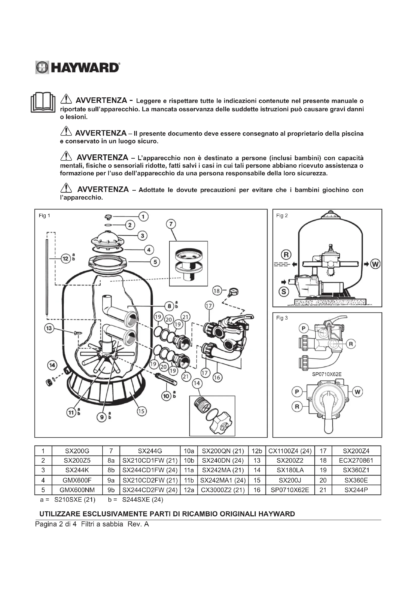 AVVERTENZA – Adottate le dovute precauzioni per evitare che i bambini giochino con l’apparecchio. SP0710X62E Fig 2 Fig 1 Fig 3 1 SX200G 7 SX244G 10a SX200QN (21) 12b CX1100Z4 (24) 17 SX200Z4 2 SX200Z5 8a SX210CD1FW (21) 10b SX240DN (24) 13 SX200Z2 18 ECX270861 3 SX244K 8b SX244CD1FW (24) 11a SX242MA (21) 14 SX180LA 19 SX360Z1 4 GMX600F 9a SX210CD2FW (21) 11b SX242MA1 (24) 15 SX200J 20 SX360E 5 GMX600NM 9b SX244CD2FW (24) 12a CX3000Z2 (21) 16 SP0710X62E 21 SX244P a = S210SXE (21) b = S244SXE (24)UTILIZZARE ESCLUSIVAMENTE PARTI DI RICAMBIO ORIGINALI HAYWARD Pagina 3 di 4 Filtri a sabbia Rev. A Acquisterete un filtro a sabbia completo di base e di valvola multivia (figura 1). FUNZIONAMENTO Il sistema di filtrazione ricorre ad una sabbia speciale destinata a intercettare le impurità contenute nell’acqua della piscina. La sabbia viene versata nella vasca e funge da sistema permanente di filtrazione. L’acqua non filtrata della piscina, che contiene impurità in sospensione, viene aspirata dalla pompa e inviata verso la valvola di controllo a più vie. All’atto del passaggio dell’acqua attraverso la sabbia, le impurità vengono intrappolate nel letto di sabbia e l’acqua che ne esce filtrata prosegue verso la piscina. INSTALLAZIONE