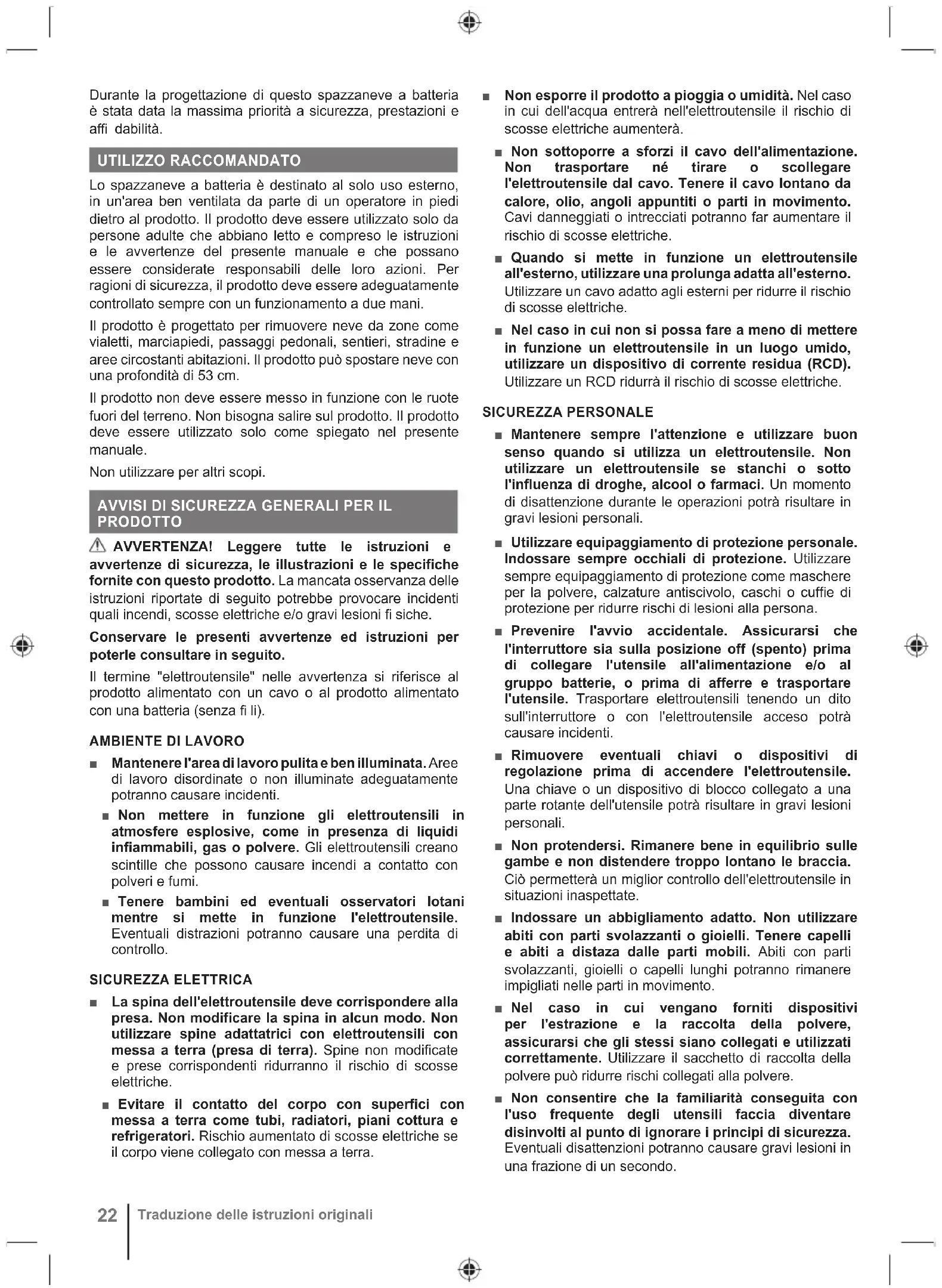 UTILIZZO ■ Prima di utilizzare il prodotto leggere, comprendere e seguire tutte le istruzioni presenti sul prodotto stesso e nel manuale. Prendere completa dimestichezza con i comandi e con l'uso corretto del prodotto. Sapere come spegnere il prodotto e disimpegnare i comandi rapidamente. ■ Non permettere mai a bambini o persone con ridotte capacità fisiche, sensoriali o mentali o a persone che non conoscono queste istruzioni di mettere in funzione, o svolgere le operazioni di pulizia e manutenzione sul prodotto. Leggi locali possono limitare l’età dell’operatore. Supervisionare adeguatamente I bambini per assicurarsi che non giochino con il prodotto. ■ Tenere osservatori, bambini e animali ad almeno 15 metri di distanza dall'area delle operazioni. Spegnere il prodotto se qualcuno entra nell'area. ■ Prestare attenzione per evitare di scivolare o cadere, soprattutto quando si utilizza il prodotto a marcia indietro. ■ Regolare l'altezza dell'alloggiamento del collettore per distanziarlo dalla superficie, se di ghiaia o di roccia frantumata. ■ Non effettuare mai operazioni di regolazione mentre il prodotto è in funzione. ■ Il prodotto è in grado di amputare mani e piedi, oltre che di scagliare oggetti a distanza. La mancata osservanza di tutte le istruzioni di sicurezza può causare lesioni gravi. ■ Ricordare che l’operatore sarà responsabile di eventuali lesioni o danni a persone o cose. PREPARAZIONE ■ Ispezionare attentamente la zona nella quale il dispositivo deve essere utilizzato e rimuovere eventuali zerbini, slitte, assi, cavi ed altri corpi estranei.24 Traduzione delle istruzioni originali ■ Disinnestare tutte le frizioni e mettere in folle prima di avviare il motore. ■ Mentre si mette in funzione il dispositivo indossare sempre abbigliamento invernale adeguato e calzature di sicurezza anti-scivolo. Evitare di indossare abbigliamento con parti svolazzanti o con cordicelle o cordini pendenti; tali elementi potranno infatti rimanere impigliati nelle parti in movimento. ■ Assicurare i capelli lunghi all'altezza delle spalle per evitare che rimangano impigliati nelle parti in movimento. ■ Indossare sempre occhiali di sicurezza o schermi per gli occhi durante l'utilizzo o durante una regolazione o riparazione, per proteggere gli occhi da corpi estranei che potrebbero essere lanciati dal prodotto. ■ Assicurarsi prima di ciascun utilizzo che tutti i comandi e i dispositivi di sicurezza funzionino correttamente. Non utilizzare il prodotto se l'interruttore "off" (spegnimento) non lo spegne. ■ Prima di ciascun utilizzo, controllare sempre che l'alloggiamento sia integro e che le protezioni e le maniglie siano in posizione e adeguatamente fissate. UTILIZZO ■ Non utilizzare il prodotto in caso di rischi di fulmini. ■ Tenere mani e piedi lontani dalle parti rotanti. Tenersi sempre lontani dalle aperture di scarico. Non inserire oggetti nelle aperture. ■ Prestare estrema cautela durante l'utilizzo o durante l'attraversamento di sentieri o vialetti di ghiaia. Restare vigili per la presenza di pericoli nascosti o durante l'utilizzo in prossimità delle vie pubbliche. ■ Per ridurre il rischio di lesioni associate al contatto con le parti mobili, spegnere sempre il prodotto e rimuovere il pacco batteria. Assicurarsi che tutte le parti in movimento si siano arrestate: ● Dopo aver colpito un corpo estraneo controllare il prodotto per individuare eventuali danni ● prima di svolgere operazioni di pulizia o rimuovere un blocco ● prima di lasciare il prodotto incustodito ● prima di svolgere operazioni di controllo, manutenzione o lavoro sul prodotto ● se il prodotto inizia a vibrare in maniera anormale (controllare immediatamente) Le vibrazioni sono in genere una spia del malfunzionamento della macchina. ■ Sui pendii procedere sempre in diagonale e mai in direzione verticale. Fare estrema attenzione quando si cambia direzione sui pendii. Non tentare di rimuovere la neve da pendii ripidi. ■ Non mettere in funzione il prodotto senza aver montato adeguati schermi e piastre o altri dispositivi di protezione di sicurezza. ■ Non dirigere mai lo scarico verso le persone o verso aree in cui si potrebbero causare danni materiali. Tenere eventuali osservatori, soprattutto animali e bambini, lontani dall’area di taglio. ■ Non sovraccaricare la capacità della macchina tentando di rimuovere la neve troppo velocemente. ■ Non utilizzare mai il prodotto ad alta velocità su superfici scivolose. Durante l'utilizzo a marcia indietro guardare dietro di sé e prestare attenzione. ■ Quando il prodotto viene trasportato o non è utilizzato, scollegare l'alimentazione da collettore e girante. ■ Utilizzare solo parti di ricambio, accessori e dispositivi originali della ditta produttrice. ■ Non utilizzare mai il prodotto in caso di scarsa visibilità o illuminazione. Verificare sempre l'appoggio dei piedi e impugnare saldamente le maniglie. Camminare, non correre mai. ■ Posizionare sempre il prodotto su superfici dure e pulite e mai su altro tipo di superfici, quando il motore è avviato. Ghiaia, sabbia e altri detriti potranno essere aspirati dalla griglia dell'aria e scagliati verso l'operatore o l'osservatore, causando gravi lesioni possibili. ■ Non mettere in funzione il prodotto accanto a divisori in vetro, automobili, finestre o porte senza aver prima regolato correttamente l'angolo di spalatura neve. ■ Se il prodotto viene fatto cadere, subisce un grave impatto oppure vibra in maniera anomala, spegnerlo immediatamente e ispezionarlo per verificare la presenza di danni o per identificare la causa delle vibrazioni. Riparare eventuali danni o far sostituire i pezzi da un centro servizi autorizzato. ■ Azionare il prodotto solo con temperature tra 0°C e 40°C. ■ Conservare il prodotto in una posizione in cui la temperatura ambiente è compresa tra 0°C e 40°C.