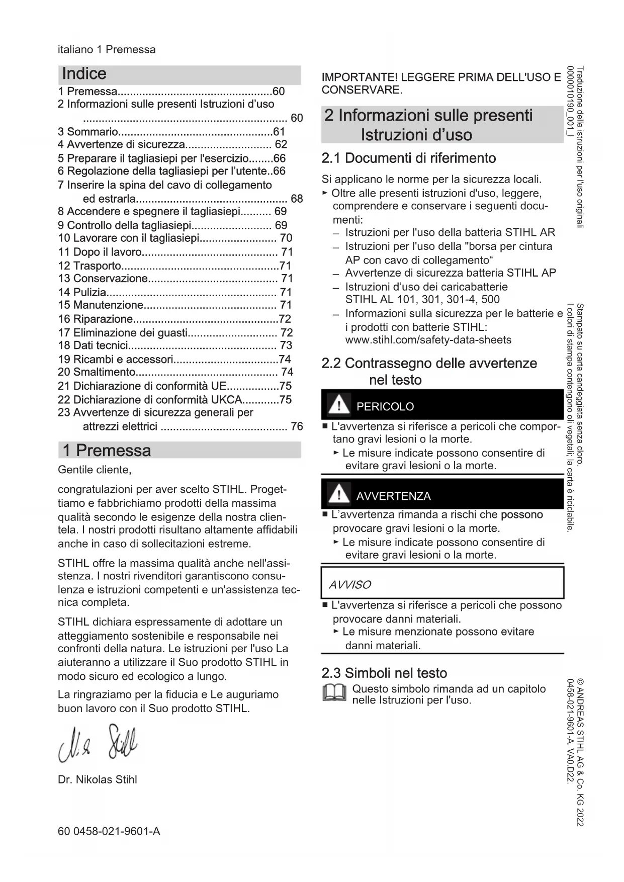 - 23 Avvertenze di sicurezza generali per attrezzi elettrici 1 Premessa Gentile cliente, congratulazioni per aver scelto STIHL. Proget‐ tiamo e fabbrichiamo prodotti della massima qualità secondo le esigenze della nostra clien‐ tela. I nostri prodotti risultano altamente affidabili anche in caso di sollecitazioni estreme. STIHL offre la massima qualità anche nell'assi‐ stenza. I nostri rivenditori garantiscono consu‐ lenza e istruzioni competenti e un'assistenza tec‐ nica completa. STIHL dichiara espressamente di adottare un atteggiamento sostenibile e responsabile nei confronti della natura. Le istruzioni per l'uso La aiuteranno a utilizzare il Suo prodotto STIHL in modo sicuro ed ecologico a lungo. La ringraziamo per la fiducia e Le auguriamo buon lavoro con il Suo prodotto STIHL. Dr. Nikolas Stihl p. 76