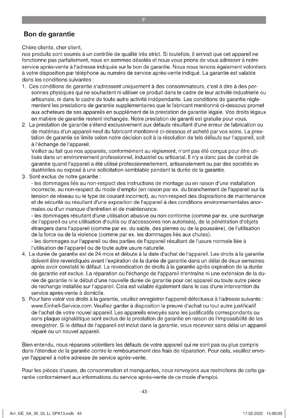 sito internet: www.Einhell-Service.com. Tenete a portata di mano il documento di acquisto o altri documenti come prova dell‘acquisto del vostro apparecchio nuovo. Apparecchi inviati senza i relativi documenti o senza targhetta d‘identifi cazione sono esclusi dalla prestazione di garanzia perché non possono essere classifi cati in modo corrispondente. Se il difetto dell‘apparecchio rientra nella nost- ra prestazione di garanzia, ricevete prontamente l‘apparecchio riparato o un apparecchio nuovo. Naturalmente eff ettuiamo a pagamento anche riparazioni sull‘apparecchio che non rientrano o non rien- trano più nella garanzia. A tale scopo inviate l‘apparecchio all‘indirizzo del nostro Centro Assistenza. Per parti mancanti, di consumo e soggette a usura rimandiamo alle limitazioni di questa garanzia secon- do le informazioni sul Servizio Assistenza di queste istruzioni per l‘uso. Anl_GE_SA_36_35_Li_SPK13.indb 55Anl_GE_SA_36_35_Li_SPK13.indb 55 17.02.2022 15:09:0617.02.2022 15:09:06DK/N