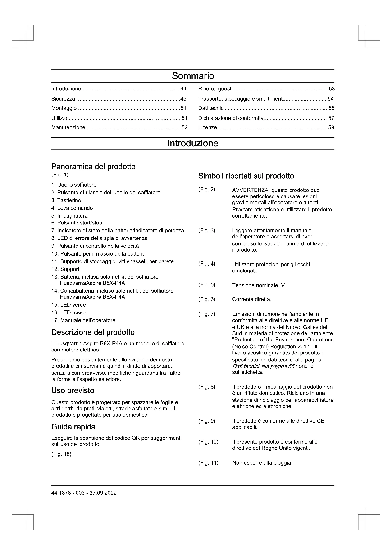 Descrizione del prodotto L’Husqvarna Aspire B8X-P4A è un modello di soffiatore con motore elettrico. Procediamo costantemente allo sviluppo dei nostri prodotti e ci riserviamo quindi il diritto di apportare, senza alcun preavviso, modifiche riguardanti fra l’altro la forma e l’aspetto esteriore. Uso previsto Questo prodotto è progettato per spazzare le foglie e altri detriti da prati, vialetti, strade asfaltate e simili. Il prodotto è progettato per uso domestico. Guida rapida Eseguire la scansione del codice QR per suggerimenti sull'uso del prodotto. (Fig. 18) Simboli riportati sul prodotto (Fig. 2) AVVERTENZA: questo prodotto può essere pericoloso e causare lesioni gravi o mortali all'operatore o a terzi. Prestare attenzione e utilizzare il prodotto correttamente. (Fig. 3) Leggere attentamente il manuale dell'operatore e accertarsi di aver compreso le istruzioni prima di utilizzare il prodotto. (Fig. 4) Utilizzare protezioni per gli occhi omologate. (Fig. 5) Tensione nominale, V (Fig. 6) Corrente diretta. (Fig. 7) Emissioni di rumore nell'ambiente in conformità alle direttive e alle norme UE e UK e alla norma del Nuovo Galles del Sud in materia di protezione dell'ambiente "Protection of the Environment Operations (Noise Control) Regulation 2017". Il livello acustico garantito del prodotto è specificato nei dati tecnici alla pagina Dati tecnici alla pagina 55 nonché sull'etichetta. (Fig. 8) Il prodotto o l'imballaggio del prodotto non è un rifiuto domestico. Riciclarlo in una stazione di riciclaggio per apparecchiature elettriche ed elettroniche. (Fig. 9) Il prodotto è conforme alle direttive CE applicabili. (Fig. 10) Il presente prodotto è conforme alle direttive del Regno Unito vigenti. (Fig. 11) Non esporre alla pioggia. 44 1876 - 003 - 27.09.2022(Fig. 15) Il conducente del soffiatore deve con- trollare che non vi siano persone od animali in un raggio di 15 metri. Anche più conducenti che lavorino contempo- raneamente nello stesso luogo devono mantenere tra loro una distanza di si- curezza non inferiore a 15 metri. Il sof- fiatore può urtare violentemente ogget- ti che possono rimbalzare, causando seri danni agli occhi se non vengono usati i dispositivi di sicurezza consiglia- ti. aaaa-ssxxxxx La targhetta dati di funzionamento mo- stra il numero di serie. aaaa è l'anno di produzione, ww è la settimana di produzione. Nota: I restanti simboli/decalcomanie applicati sul prodotto riguardano particolari requisiti necessari per ottenere la certificazione in alcuni mercati. Simboli sulla batteria e/o sul caricabatterie (Fig. 16) Riciclare questo pro- dotto in una stazio- ne di riciclaggio per apparecchiature elet- triche ed elettroniche. (Solo per l'Europa) (Fig. 17) Utilizzare la batteria solo nei prodotti dei partner del sistema POWER FOR ALL. (Fig. 12) Trasformatore a prova di guasto. (Fig. 13) Utilizzare e conservare il caricabatteria solo in ambienti interni. (Fig. 14) Doppio isolamento. Responsabilità del prodotto Come indicato nelle leggi vigenti in materia di responsabilità obbligatoria sul prodotto, non siamo responsabili per eventuali danni causati dal nostro prodotto se: