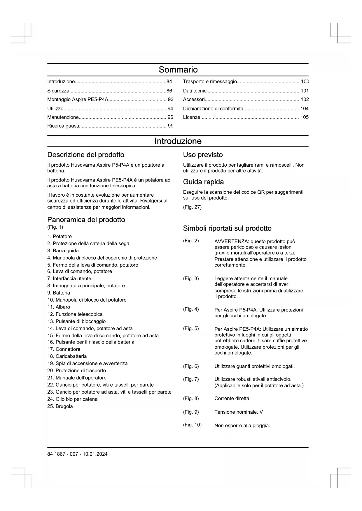 Simboli riportati sul prodotto (Fig. 2) AVVERTENZA: questo prodotto può essere pericoloso e causare lesioni gravi o mortali all'operatore o a terzi. Prestare attenzione e utilizzare il prodotto correttamente. (Fig. 3) Leggere attentamente il manuale dell'operatore e accertarsi di aver compreso le istruzioni prima di utilizzare il prodotto. (Fig. 4) Per Aspire P5-P4A: Utilizzare protezioni per gli occhi omologate. (Fig. 5) Per Aspire PE5-P4A: Utilizzare un elmetto protettivo in luoghi in cui gli oggetti potrebbero cadere. Usare cuffie protettive omologate. Utilizzare protezioni per gli occhi omologate. (Fig. 6) Utilizzare guanti protettivi omologati. (Fig. 7) Utilizzare robusti stivali antiscivolo. (Applicabile solo per il potatore ad asta.) (Fig. 8) Corrente diretta. (Fig. 9) Tensione nominale, V (Fig. 10) Non esporre alla pioggia. 84 1867 - 007 - 10.01.2024(Fig. 11) Rabbocco olio della catena. (Fig. 12) Direzione di rotazione, catena. (Fig. 13) Rischio di lesioni. Tenere le mani lontane dalla catena della sega. (Fig. 14) Ruotare a sinistra per allentare la manopola, ruotare a destra per serrarla. (Fig. 15) Il prodotto è conforme alle direttive UE vigenti. (Fig. 16) Il presente prodotto è conforme alle direttive del Regno Unito vigenti. (Fig. 17) Emissioni di rumore nell'ambiente in conformità alle direttive e alle norme UE e UK e alla norma del Nuovo Galles del Sud in materia di protezione dell'ambiente "Protection of the Environment Operations (Noise Control) Regulation 2017". Il livello acustico garantito del prodotto è specificato nei dati tecnici alla pagina Dati tecnici alla pagina 101 nonché sull'etichetta. (Fig. 18) Il prodotto o l'imballaggio del prodotto non è un rifiuto domestico. Riciclarlo in una stazione di riciclaggio per apparecchiature elettriche ed elettroniche. (Fig. 21) Questo prodotto non è isolato elettricamente. Se il prodotto viene a trovarsi a contatto o nelle vicinanze di cavi conduttori di tensione si può incorrere in lesioni gravi o mortali. L'elettricità può essere condotta da un punto all'altro tramite un cosiddetto arco di tensione. Più la tensione è alta, maggiore è lo spazio attraverso il quale è possibile condurre l'elettricità. L'elettricità può anche essere condotta tramite rami o altri oggetti, particolarmente se bagnati. Mantenere sempre una distanza di almeno 10 m fra il prodotto e le linee elettriche ad alta tensione e/o l'oggetto che si trova a contatto con esse. Se è necessario lavorare con una di- stanza di sicurezza inferiore, contattare sempre l’azienda distributrice dell’energia per assicurarsi che la tensione sia staccata nel momento in cui si inizia il lavoro. Durante il lavoro l'utilizzatore del prodotto deve accertarsi che non ci siano perso- ne o animali in un raggio di 15 metri. (Applicabile solo per il potatore ad asta.) (Fig. 22) La targhetta dati di funzionamento o la stampa al laser mostrano il numero di serie. yyyy è l'anno di produzione e ww è la settimana di produzione. Nota: I restanti simboli/decalcomanie applicati sul prodotto riguardano particolari requisiti necessari per ottenere la certificazione in alcuni mercati. Simboli sulla batteria e/o sul caricabatterie (Fig. 23) Riciclare questo pro- dotto in una stazio- ne di riciclaggio per apparecchiature elet- triche ed elettroniche. (Solo per l'Europa) (Fig. 24) Utilizzare la batteria solo nei prodotti dei partner del sistema POWER FOR ALL. (Fig. 25) Proteggere la batteria dal calore, ad esempio da luce solare intensa conti- nua, fuoco, sporcizia, acqua e umidità. C'è il rischio di esplosione e cortocircui- to. (Fig. 26) (Fig. 19) Utilizzare e conservare il caricabatteria solo in ambienti interni. (Fig. 20) Doppio isolamento. Danni al prodotto Non siamo responsabili dei danni al prodotto se: