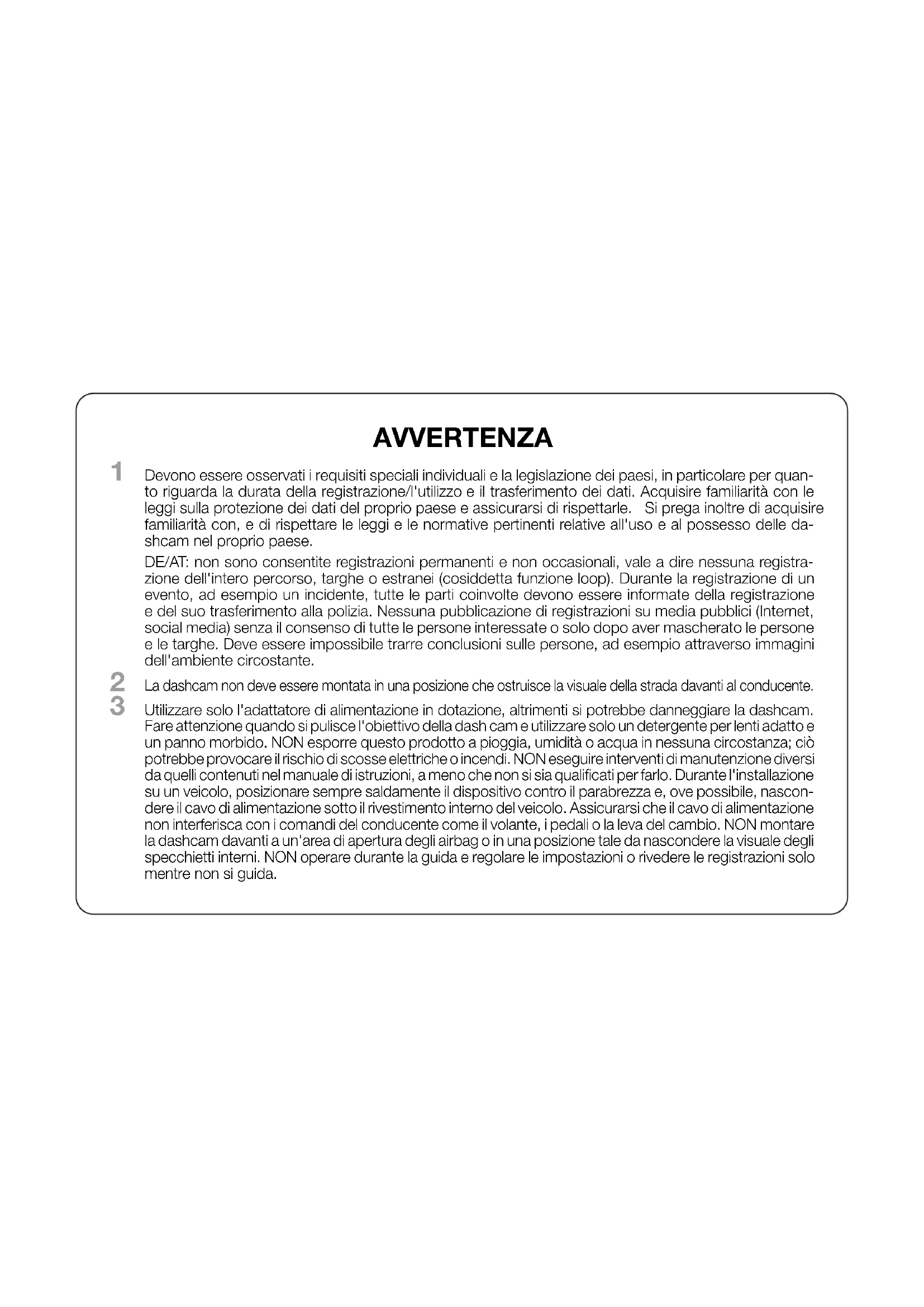 Devono essere osservati i requisiti speciali individuali e la legislazione dei paesi, in particolareper quan- to riguarda la durata della registrazione/l'utilizzoe il trasferimento dei dati. Acquisire familiarità con le leggi sulla protezionedei dati del proprio paese e assicurarsi dirispettarle. Si prega inoltre di acquisire familiarità con, e di rispettarele leggi e le normative pertinenti relative all'usoe al possesso delle da- shcam nel propriopaese.