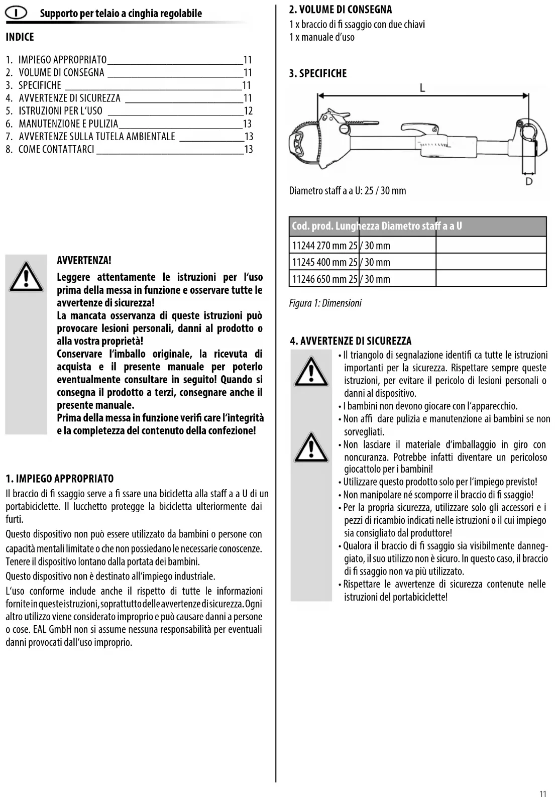 - Rispettare le avvertenze di sicurezza contenute nelle istruzioni del portabiciclette! Supporto per telaio a cinghia regolabile AVVERTENZA! Leggere attentamente le istruzioni per l‘uso prima della messa in funzione e osservare tutte le avvertenze di sicurezza! La mancata osservanza di queste istruzioni può provocare lesioni personali, danni al prodotto o alla vostra proprietà! Conservare l‘imballo originale, la ricevuta di acquista e il presente manuale per poterlo eventualmente consultare in seguito! Quando si consegna il prodotto a terzi, consegnare anche il presente manuale. Prima della messa in funzione veri care l‘integrità e la completezza del contenuto della confezione! Figura 1: Dimensioni Cod. prod. Lunghezza Diametro sta a a U 11244 270 mm 25 / 30 mm 11245 400 mm 25 / 30 mm 11246 650 mm 25 / 30 mm Diametro sta a a U: 25 / 30 mm12 Se il supporto del telaio è impostato su 180°, la funzione di sicurezza della serratura non viene più fornita. Pertanto, utilizzare il supporto del telaio solo con una „leggera piegatura“.