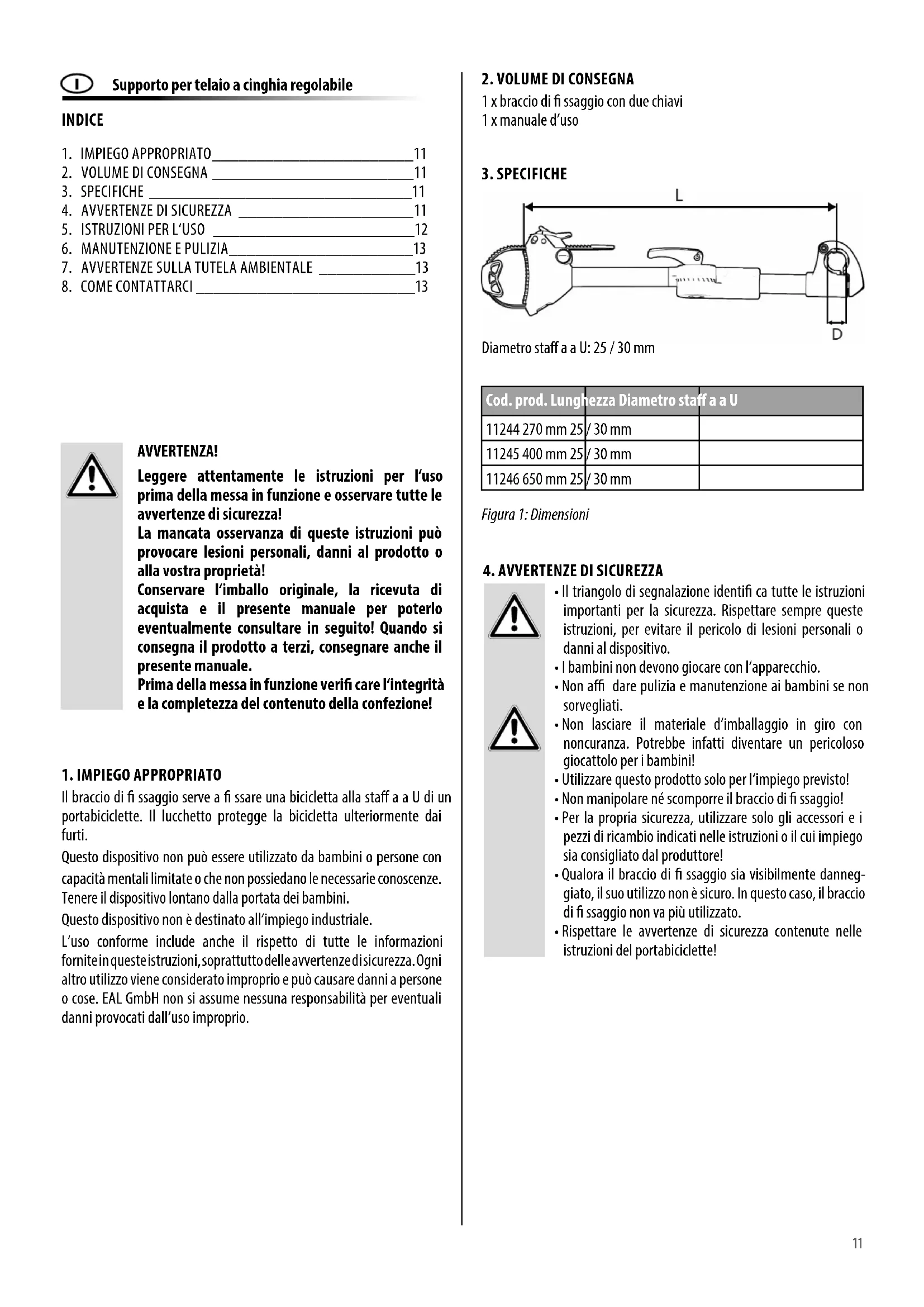 - Rispettare le avvertenze di sicurezza contenute nelle istruzioni del portabiciclette! Supporto per telaio a cinghia regolabile AVVERTENZA! Leggere attentamente le istruzioni per l‘uso prima della messa in funzione e osservare tutte le avvertenze di sicurezza! La mancata osservanza di queste istruzioni può provocare lesioni personali, danni al prodotto o alla vostra proprietà! Conservare l‘imballo originale, la ricevuta di acquista e il presente manuale per poterlo eventualmente consultare in seguito! Quando si consegna il prodotto a terzi, consegnare anche il presente manuale. Prima della messa in funzione veri care l‘integrità e la completezza del contenuto della confezione! Figura 1: Dimensioni Cod. prod. Lunghezza Diametro sta a a U 11244 270 mm 25 / 30 mm 11245 400 mm 25 / 30 mm 11246 650 mm 25 / 30 mm Diametro sta a a U: 25 / 30 mm12 Se il supporto del telaio è impostato su 180°, la funzione di sicurezza della serratura non viene più fornita. Pertanto, utilizzare il supporto del telaio solo con una „leggera piegatura“.