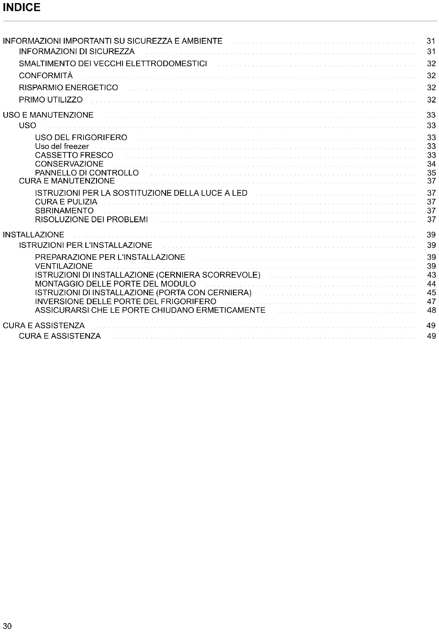 CURA E ASSISTENZA . . . . . . . . . . . . . . . . . . . . . . . . . . . . . . . . . . . . . . . . . . . . . . . . . . . . . . . . . . . . . . . . . . . . . . . . . . . . 49 CURA E ASSISTENZA . . . . . . . . . . . . . . . . . . . . . . . . . . . . . . . . . . . . . . . . . . . . . . . . . . . . . . . . . . . . . . . . . . . . . . . . 49INFORMAZIONI IMPORTANTI SU SICUREZZA E AMBIENTE Grazie per aver acquistato questo prodotto. Prima di usare il frigorifero, leggere attentamente il presente manuale di istruzioni per trarre il massimo dalle sue prestazioni. Conservare tutta la documentazione per una consultazione successiva o per i futuri proprietari. Questo prodotto è destinato unicamente all'uso domestico o ad applicazioni simili, ad esempio: Cucine destinate al personale di negozi, uffici e altri ambienti lavorativi; in agriturismi o uso da parte di clienti di hotel, motel, bed and breakfast e altri ambienti residenziali. Servizi di catering e applicazioni simili che non coinvolgono vendita al dettaglio. Questo frigorifero deve essere usato solo per la conservazione di cibi e qualsiasi uso diverso è considerato pericoloso. Il produttore non sarà responsabile per eventuali omissioni da parte dell'utente. Si raccomanda, inoltre, di prendere visione delle condizioni di garanzia. AVVERTENZA Rischio di incendio/materiali infiammabili Questo frigorifero non è destinato ad essere utilizzato da persone (bambini compresi) con ridotte capacità fisiche, sensoriali o mentali o prive dell'esperienza e delle conoscenze necessarie, se non supervisionate o istruite all'uso del frigorifero da una persona responsabile della loro sicurezza. I bambini dovrebbero essere sorvegliati per controllare che non giochino con il frigorifero. Se è danneggiato, il cavo di alimentazione deve essere sostituito dal produttore, dal suo tecnico di assistenza o da persone altrettanto qualificate, in modo da evitare pericoli. AVVERTENZA mantenere libere da ostruzioni le aperture di ventilazione nell'involucro del frigorifero o nella struttura integrata. AVVERTENZA non usare dispositivi meccanici o altri mezzi, diversi da quelli raccomandati dal produttore, per accelerare il processo di sbrinamento. AVVERTENZA non danneggiare il circuito refrigerante. AVVERTENZA non usare dispositivi elettrici all'interno dei vani di conservazione, a meno che non siano del tipo raccomandato dal produttore. AVVERTENZA Quando si posiziona il frigorifero, verificare che il cavo di alimentazione non sia incastrato o danneggiato. AVVERTENZA Non collocare prese elettriche multiple o alimentatori portatili sul retro del frigorifero. Non conservare in questo frigorifero oggetti esplosivi come, ad esempio, bombolette spray con propellente infiammabile. Questo frigorifero è destinato a essere utilizzato in ambiente domestico o simile, ad esempio: