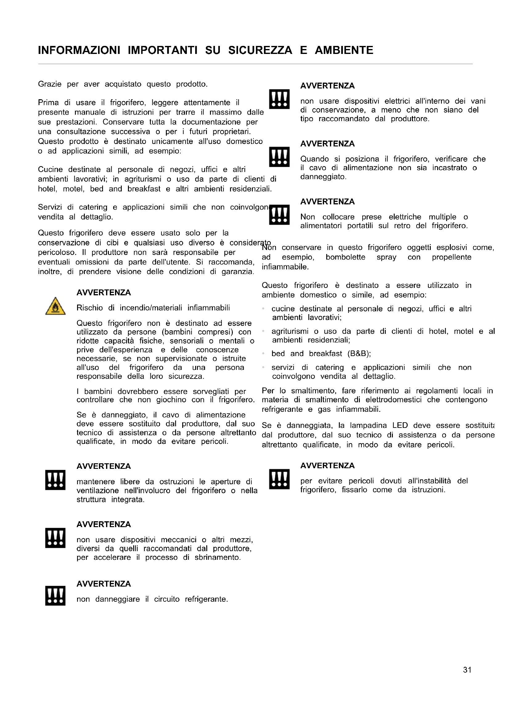 CURA E ASSISTENZA . . . . . . . . . . . . . . . . . . . . . . . . . . . . . . . . . . . . . . . . . . . . . . . . . . . . . . . . . . . . . . . . . . . . . . . . . . . . 49 CURA E ASSISTENZA . . . . . . . . . . . . . . . . . . . . . . . . . . . . . . . . . . . . . . . . . . . . . . . . . . . . . . . . . . . . . . . . . . . . . . . . 49INFORMAZIONI IMPORTANTI SU SICUREZZA E AMBIENTE Grazie per aver acquistato questo prodotto. Prima di usare il frigorifero, leggere attentamente il presente manuale di istruzioni per trarre il massimo dalle sue prestazioni. Conservare tutta la documentazione per una consultazione successiva o per i futuri proprietari. Questo prodotto è destinato unicamente all'uso domestico o ad applicazioni simili, ad esempio: Cucine destinate al personale di negozi, uffici e altri ambienti lavorativi; in agriturismi o uso da parte di clienti di hotel, motel, bed and breakfast e altri ambienti residenziali. Servizi di catering e applicazioni simili che non coinvolgono vendita al dettaglio. Questo frigorifero deve essere usato solo per la conservazione di cibi e qualsiasi uso diverso è considerato pericoloso. Il produttore non sarà responsabile per eventuali omissioni da parte dell'utente. Si raccomanda, inoltre, di prendere visione delle condizioni di garanzia. AVVERTENZA Rischio di incendio/materiali infiammabili Questo frigorifero non è destinato ad essere utilizzato da persone (bambini compresi) con ridotte capacità fisiche, sensoriali o mentali o prive dell'esperienza e delle conoscenze necessarie, se non supervisionate o istruite all'uso del frigorifero da una persona responsabile della loro sicurezza. I bambini dovrebbero essere sorvegliati per controllare che non giochino con il frigorifero. Se è danneggiato, il cavo di alimentazione deve essere sostituito dal produttore, dal suo tecnico di assistenza o da persone altrettanto qualificate, in modo da evitare pericoli. AVVERTENZA mantenere libere da ostruzioni le aperture di ventilazione nell'involucro del frigorifero o nella struttura integrata. AVVERTENZA non usare dispositivi meccanici o altri mezzi, diversi da quelli raccomandati dal produttore, per accelerare il processo di sbrinamento. AVVERTENZA non danneggiare il circuito refrigerante. AVVERTENZA non usare dispositivi elettrici all'interno dei vani di conservazione, a meno che non siano del tipo raccomandato dal produttore. AVVERTENZA Quando si posiziona il frigorifero, verificare che il cavo di alimentazione non sia incastrato o danneggiato. AVVERTENZA Non collocare prese elettriche multiple o alimentatori portatili sul retro del frigorifero. Non conservare in questo frigorifero oggetti esplosivi come, ad esempio, bombolette spray con propellente infiammabile. Questo frigorifero è destinato a essere utilizzato in ambiente domestico o simile, ad esempio: