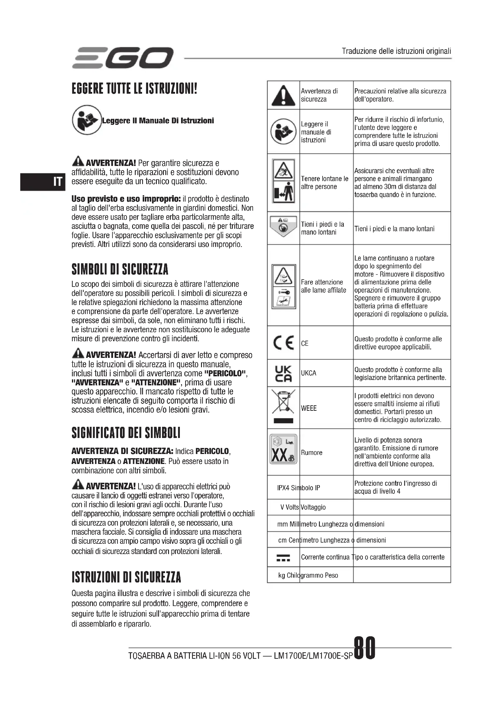 RumoreLivello di potenza sonora garantito. Emissione di rumore nell'ambiente conforme alla direttiva dell'Unione europea.IPX4 Simbolo IPProtezione contro l'ingresso di acqua di livello 4V Volts Voltaggiomm Millimetro Lunghezza o dimensionicm Centimetro Lunghezza o dimensioniCorrente continua Tipo o caratteristica della correntekg Chilogrammo PesoTraduzione delle istruzioni originaliTOSAERBA A BATTERIA LI-ION 56 VOLT — LM1700E/LM1700E-SP 81