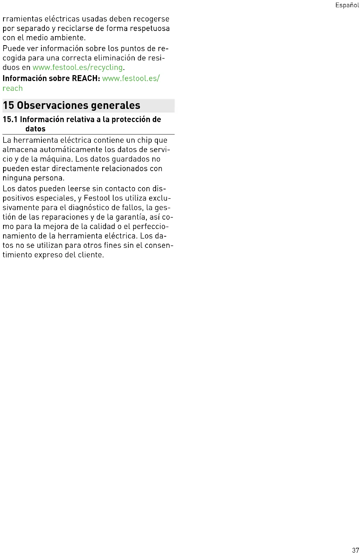 – Dopo una lavorazione su metallo: soffiare aria compressa asciutta e priva di olio al l’interno dell’elettroutensile attraverso le aperture d’aerazione. In caso contrario, al l’interno dell’elettroutensile potrà deposi Italiano 43tarsi polvere conduttiva, con rischio di cor tocircuito. – Per garantire la circolazione dell’aria, mantenere sempre sgombre e pulite le aperture per l’aria di raffreddamento sulla carcassa motore. – L'attacco utensile deve essere sempre te nuto pulito e libero da trucioli e corpi estra nei. Togliere la lama dall'elettroutensile (vedere il capitolo 9.3) e pulire l'attacco utensile (ad es. con un pennello o con aria compressa). Mantenere funzionante l'attacco utensile utilizzando un lubrificante idoneo (ad es. olio per utensili). – Mantenere sempre puliti i contatti dell’elet troutensile e della batteria. 13 Accessori Utilizzare esclusivamente utensili accessori ed attrezzi originali Festool. L’impiego di uten sili accessori di inferiore qualità e di accessori di produttori terzi può aumentare il pericolo di lesioni e comportare forti sbilanciamenti, che pregiudicano la qualità del lavoro ed accelerano l’usura dell’elettroutensile. I numeri d’ordine per accessori e utensili sono riportati nel catalogo Festool, oppure in Inter net, all’indirizzo www.festool.it. 14 Ambiente Non gettare l’utensile fra i rifiuti dome stici! Avviare utensili, accessori ed im ballaggi ad un riciclo rispettoso dell’am biente. Attenersi alle disposizioni di legge na zionali in vigore. Prima dello smaltimento, le vecchie batterie e gli accumulatori scarichi che non sono inclusi nel vecchio apparecchio, così come le lampadi ne che possono essere rimosse senza essere distrutte, devono essere separate dal vecchio apparecchio. Così i rifiuti di batterie e accumu latori verranno sottoposti a un processo di rici claggio controllato. Nel rispetto della direttiva europea in materia di apparecchiature elettriche ed elettroniche usate e delle rispettive leggi nazionali derivate ne, gli elettroutensili devono essere raccolti se paratamente e introdotti nell'apposito ciclo di smaltimento e recupero a tutela dell'ambiente. Le informazioni sui punti di raccolta per un cor retto smaltimento sono disponibili su www.festool.it/recycling. Informazioni su REACH: www.festool.it/reach 15 Indicazioni generali