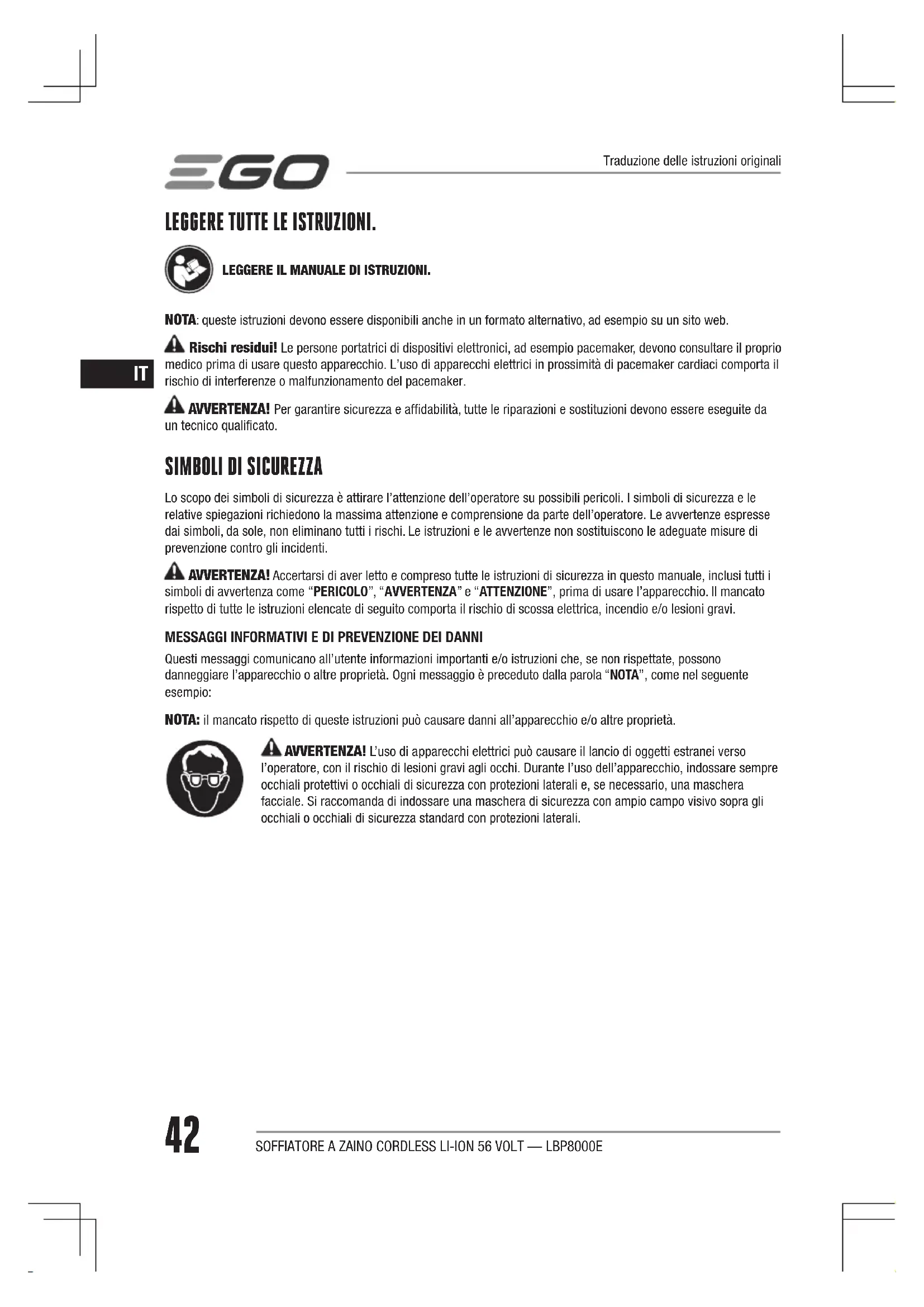 SOFFIATORE A ZAINO CORDLESS LI-ION 56 VOLT — LBP8000E LEGGERE TUTTE LE ISTRUZIONI. LEGGERE IL MANUALE DI ISTRUZIONI. NOTA: queste istruzioni devono essere disponibili anche in un formato alternativo, ad esempio su un sito web. Rischi residui! Le persone portatrici di dispositivi elettronici, ad esempio pacemaker, devono consultare il proprio medico prima di usare questo apparecchio. L’uso di apparecchi elettrici in prossimità di pacemaker cardiaci comporta il rischio di interferenze o malfunzionamento del pacemaker. AVVERTENZA! Per garantire sicurezza e affidabilità, tutte le riparazioni e sostituzioni devono essere eseguite da un tecnico qualificato.