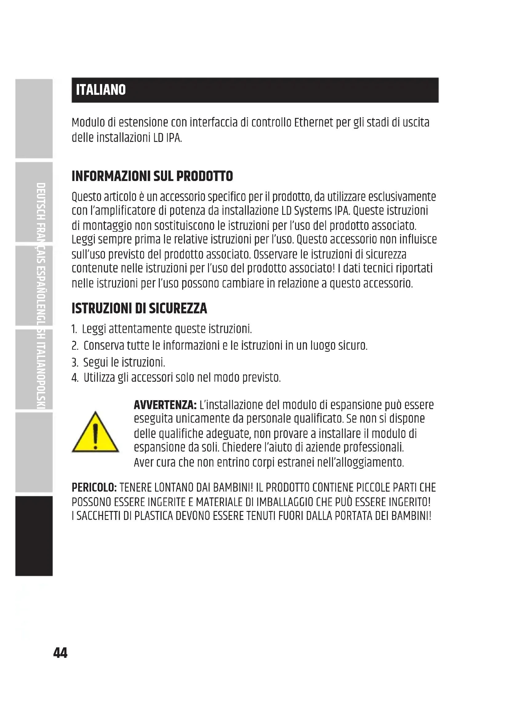 ENGLISH44 ITALIANO Modulo di estensione con interfaccia di controllo Ethernet per gli stadi di uscita delle installazioni LD IPA.