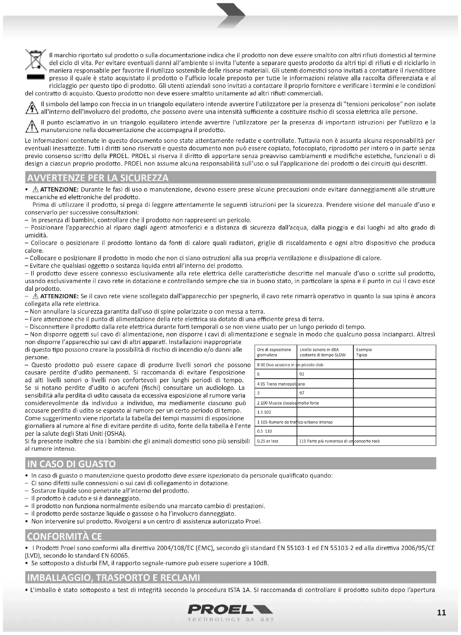 - I Prodo Proel sono desna esclusivamente ad un ulizzo specico di po sonoro: segnali di ingresso di po audio (20Hz-20kHz). Proel declina ogni responsabilità per danni a terzi causa da mancata manutenzione, manomissioni, uso improprio o installazione non eseguita secondo le norme di sicurezza e a regola d'arte.