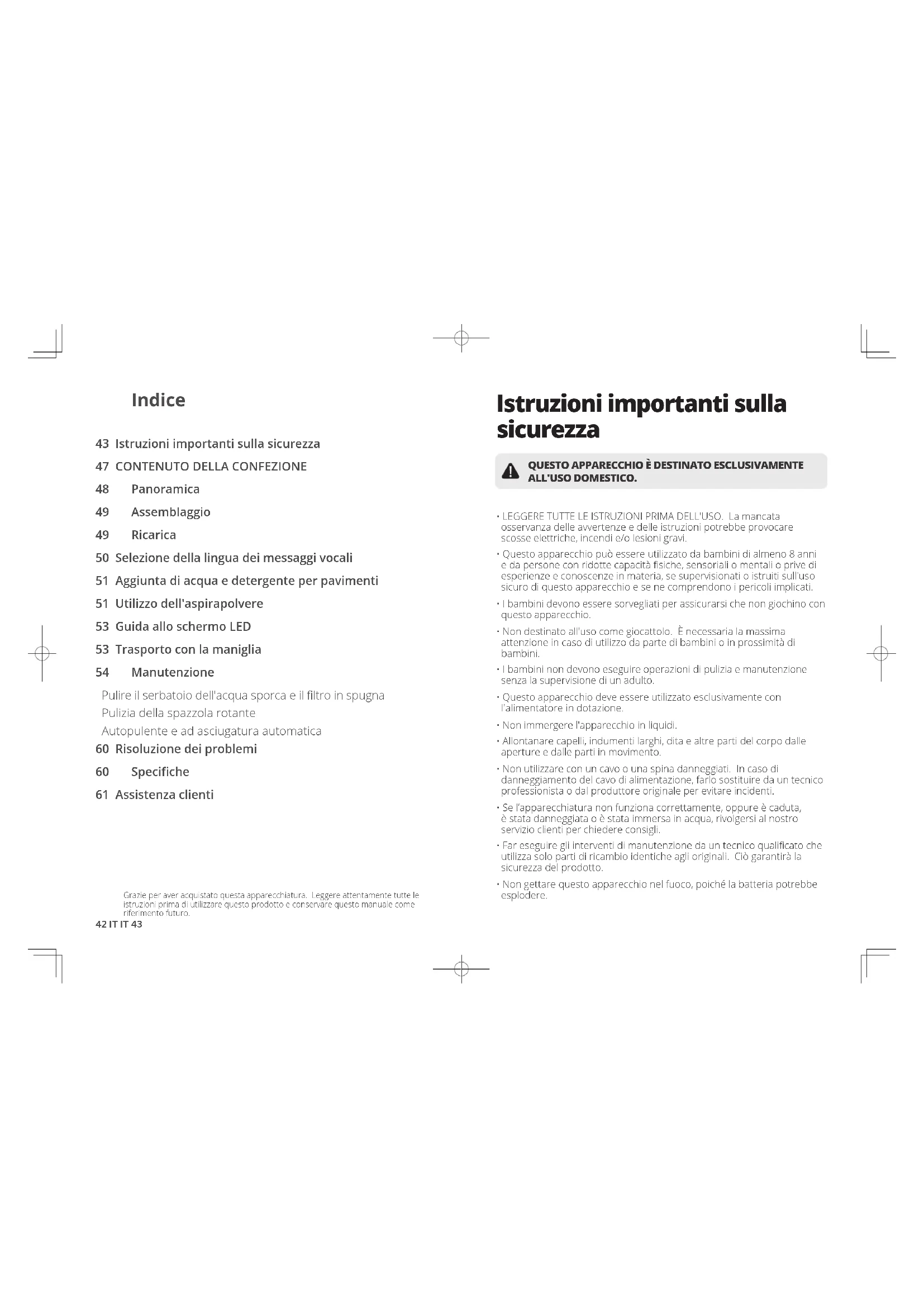 48 Panoramica 49 Assemblaggio 49 Ricarica 50 Selezione della lingua dei messaggi vocali 51 Aggiunta di acqua e detergente per pavimenti 51 Utilizzo dell'aspirapolvere 53 Guida allo schermo LED 53 Trasporto con la maniglia 54 Manutenzione Pulire il serbatoio dell'acqua sporca e il filtro in spugna Pulizia della spazzola rotante Autopulente e ad asciugatura automatica 60 Risoluzione dei problemi 60 Specifiche 61 Assistenza clienti Istruzioni importanti sulla sicurezza