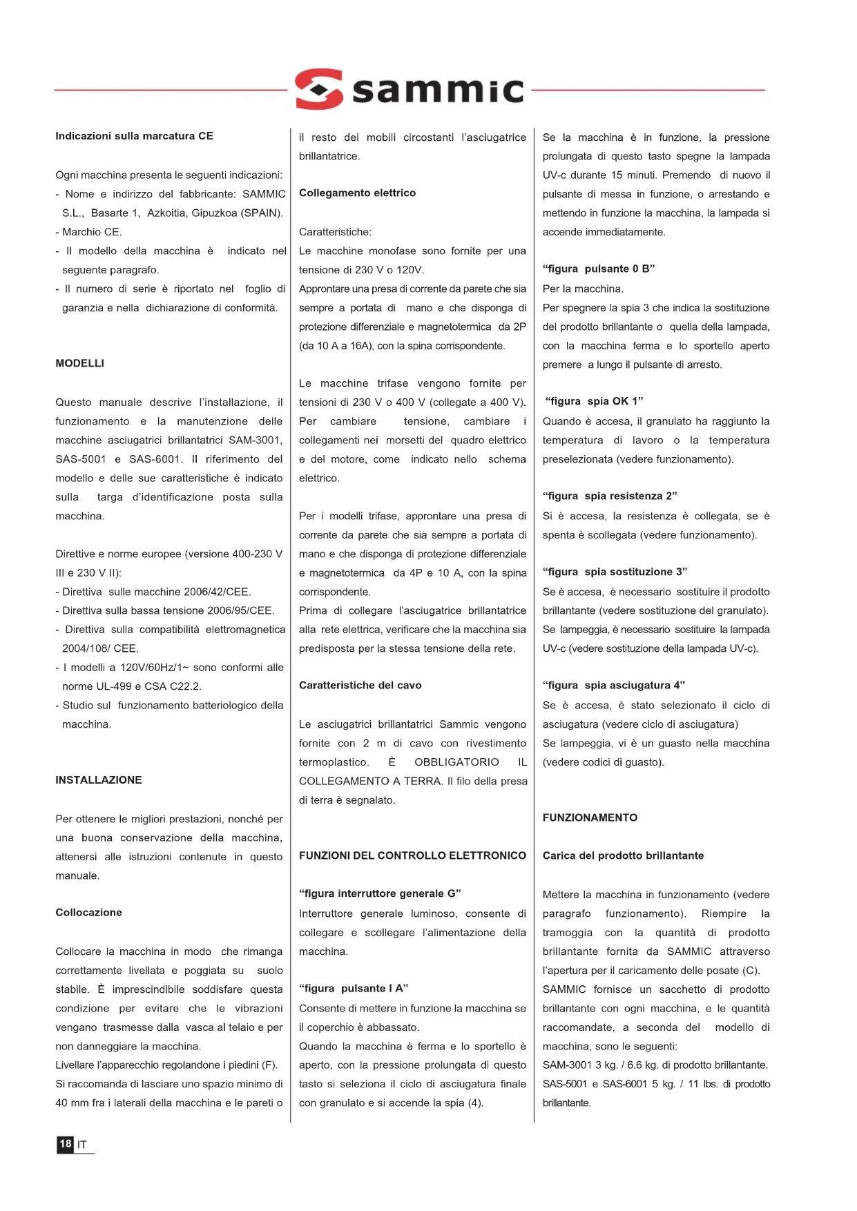 FRIndicazioni sulla marcatura CE Ogni macchina presenta le seguenti indicazioni: - Nome e indirizzo del fabbricante: SAMMIC S.L., Basarte 1, Azkoitia, Gipuzkoa (SPAIN). - Marchio CE. - Il modello della macchina è indicato nel seguente paragrafo. - Il numero di serie è riportato nel foglio di garanzia e nella dichiarazione di conformità. MODELLI Questo manuale descrive l’installazione, il funzionamento e la manutenzione delle macchine asciugatrici brillantatrici SAM-3001, SAS-5001 e SAS-6001. Il riferimento del modello e delle sue caratteristiche è indicato sulla targa d’identificazione posta sulla macchina. Direttive e norme europee (versione 400-230 V III e 230 V II): - Direttiva sulle macchine 2006/42/CEE. - Direttiva sulla bassa tensione 2006/95/CEE. - Direttiva sulla compatibilità elettromagnetica 2004/108/ CEE. - I modelli a 120V/60Hz/1~ sono conformi alle norme UL-499 e CSA C22.2. - Studio sul funzionamento batteriologico della macchina. INSTALLAZIONE Per ottenere le migliori prestazioni, nonché per una buona conservazione della macchina, attenersi alle istruzioni contenute in questo manuale. Collocazione Collocare la macchina in modo che rimanga correttamente livellata e poggiata su suolo stabile. È imprescindibile soddisfare questa condizione per evitare che le vibrazioni vengano trasmesse dalla vasca al telaio e per non danneggiare la macchina. Livellare l’apparecchio regolandone i piedini (F). Si raccomanda di lasciare uno spazio minimo di 40 mm fra i laterali della macchina e le pareti o il resto dei mobili circostanti l’asciugatrice brillantatrice. Collegamento elettrico Caratteristiche: Le macchine monofase sono fornite per una tensione di 230 V o 120V. Approntare una presa di corrente da parete che sia sempre a portata di mano e che disponga di protezione differenziale e magnetotermica da 2P (da 10 A a 16A), con la spina corrispondente. Le macchine trifase vengono fornite per tensioni di 230 V o 400 V (collegate a 400 V). Per cambiare tensione, cambiare i collegamenti nei morsetti del quadro elettrico e del motore, come indicato nello schema elettrico. Per i modelli trifase, approntare una presa di corrente da parete che sia sempre a portata di mano e che disponga di protezione differenziale e magnetotermica da 4P e 10 A, con la spina corrispondente. Prima di collegare l’asciugatrice brillantatrice alla rete elettrica, verificare che la macchina sia predisposta per la stessa tensione della rete. Caratteristiche del cavo Le asciugatrici brillantatrici Sammic vengono fornite con 2 m di cavo con rivestimento termoplastico. È OBBLIGATORIO IL COLLEGAMENTO A TERRA. Il filo della presa di terra è segnalato.