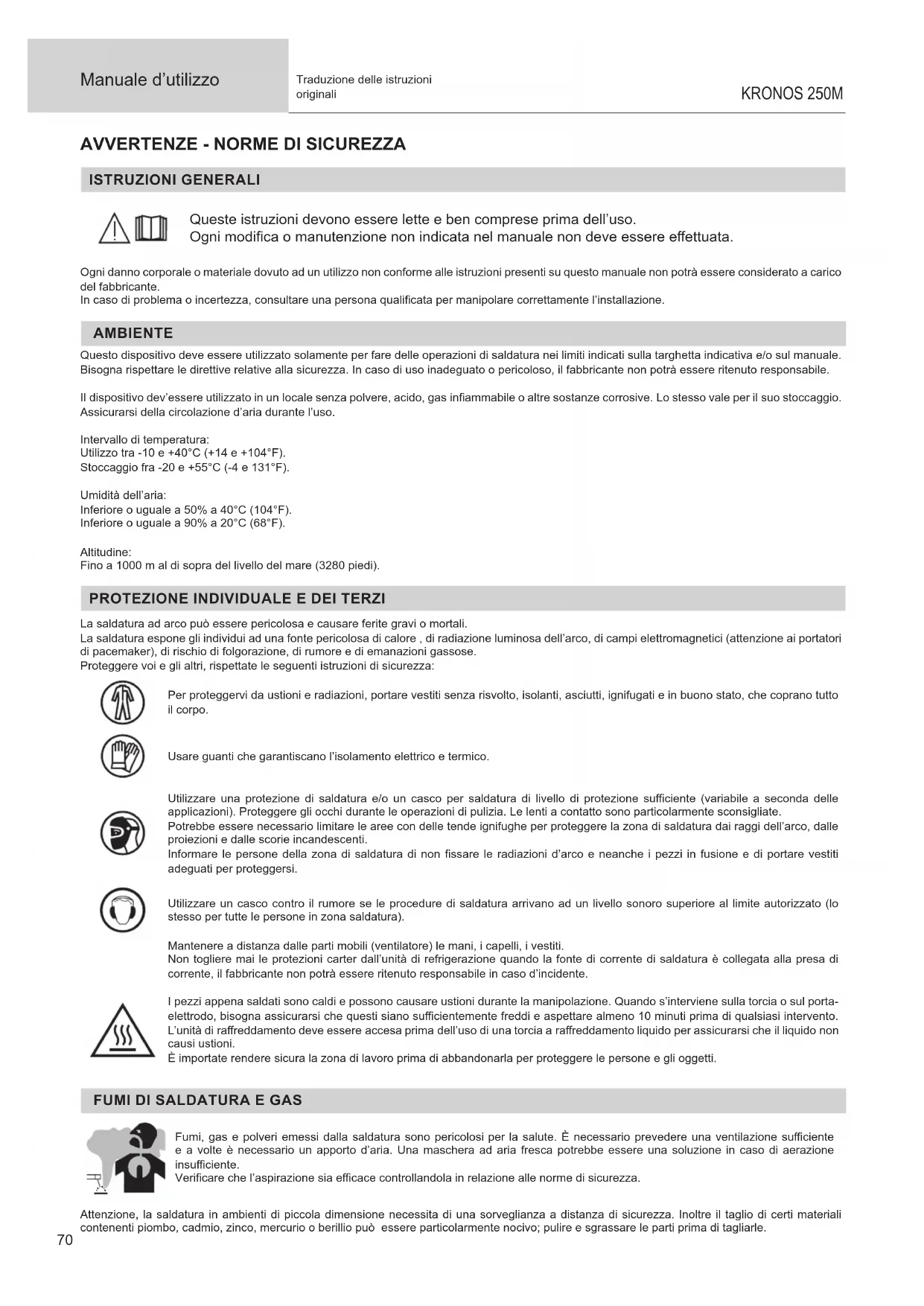 Manuale d’utilizzo KRONOS 250M Traduzione delle istruzioni originali Le bombole devono essere posizionate in locali aperti ed aerati. Devono essere in posizione verticale su supporto o su un carrello. La saldatura è proibita se eettuata in prossimità di grasso o vernici.