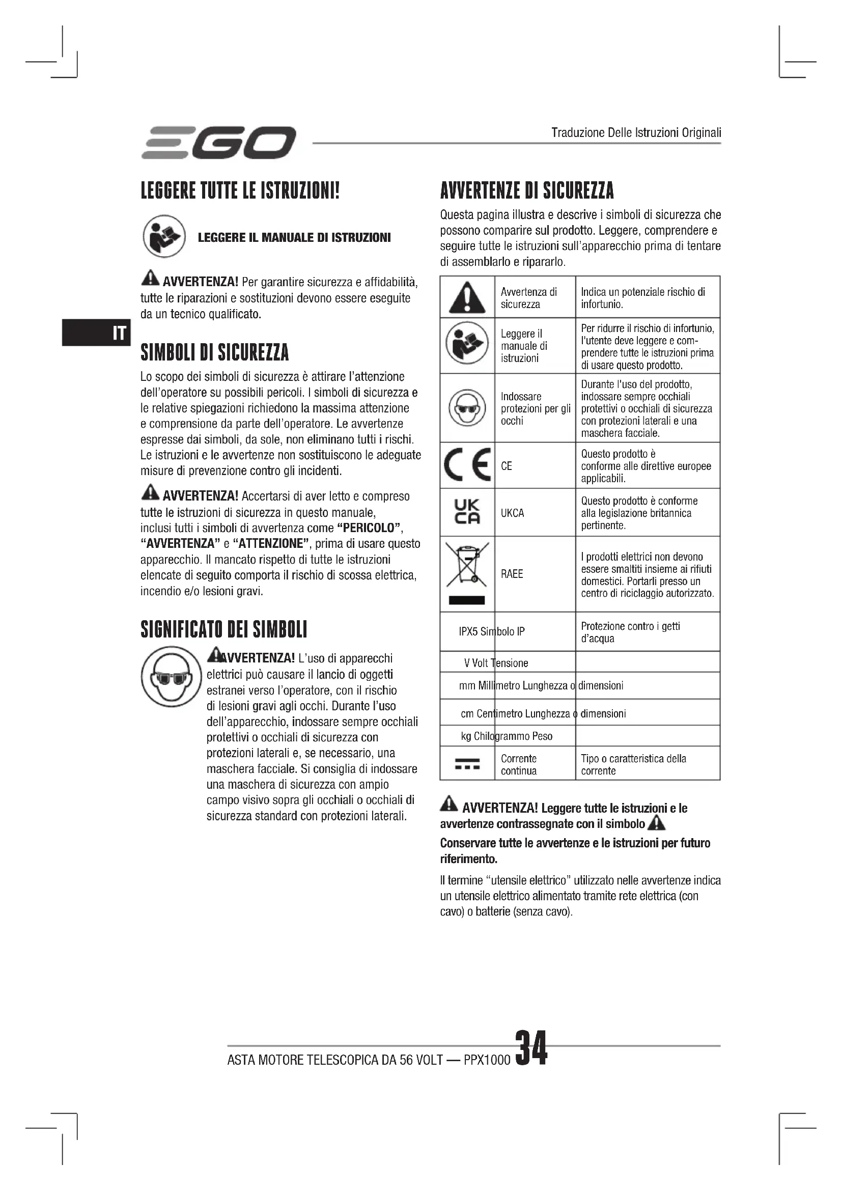 Questa pagina illustra e descrive i simboli di sicurezza che possono comparire sul prodotto. Leggere, comprendere e seguire tutte le istruzioni sull’apparecchio prima di tentare di assemblarlo e ripararlo. Avvertenza di sicurezzaIndica un potenziale rischio di infortunio.Leggere il manuale di istruzioniPer ridurre il rischio di infortunio, l'utente deve leggere e com-prendere tutte le istruzioni prima di usare questo prodotto.Indossare protezioni per gli occhiDurante l'uso del prodotto, indossare sempre occhiali protettivi o occhiali di sicurezza con protezioni laterali e una maschera facciale. Questo prodotto è conforme alle direttive europee applicabili. UKCA Questo prodotto è conforme alla legislazione britannica pertinente. RAEE I prodotti elettrici non devono essere smaltiti insieme ai rifiuti domestici. Portarli presso un centro di riciclaggio autorizzato.IPX5 Simbolo IPProtezione contro i getti d’acquaV Volt Tensionemm Millimetro Lunghezza o dimensionicm Centimetro Lunghezza o dimensionikg Chilogrammo PesoCorrente continuaTipo o caratteristica della corrente AVVERTENZA! Leggere tutte le istruzioni e le avvertenze contrassegnate con il simbolo . Conservare tutte le avvertenze e le istruzioni per futuro riferimento. Il termine “utensile elettrico” utilizzato nelle avvertenze indica un utensile elettrico alimentato tramite rete elettrica (con cavo) o batterie (senza cavo). Traduzione Delle Istruzioni OriginaliASTA MOTORE TELESCOPICA DA 56 VOLT — PPX1000 35