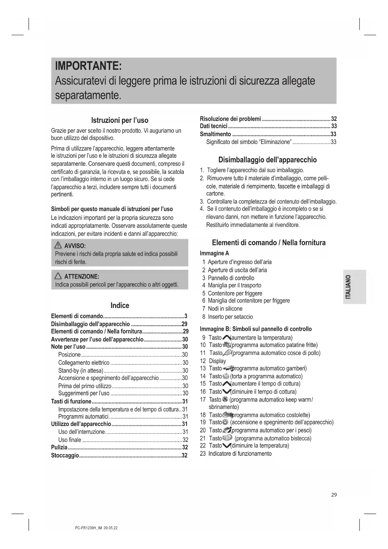 rilevano danni, non mettere in funzione l’apparecchio. Restituirlo immediatamente al rivenditore. Elementi di comando / Nella fornitura Immagine A 1 Aperture d’ingresso dell’aria 2 Aperture di uscita dell’aria 3 Pannello di controllo 4 Maniglia per il trasporto 5 Contenitore per friggere 6 Maniglia del contenitore per friggere 7 Nodi in silicone 8 Inserto per setaccio Immagine B: Simboli sul pannello di controllo 9 Tasto (aumentare la temperatura) 10 Tasto (programma automatico patatine fritte) 11 Tasto (programma automatico cosce di pollo) 12 Display 13 Tasto (programma automatico gamberi) 14 Tasto (torta a programma automatico) 15 Tasto (aumentare il tempo di cottura) 16 Tasto (diminuire il tempo di cottura) 17 Tasto (programma automatico keep warm / sbrinamento) 18 Tasto (programma automatico costolette) 19 Tasto (accensione e spegnimento dell’apparecchio) 20 Tasto (programma automatico per i pesci) 21 Tasto (programma automatico bistecca) 22 Tasto (diminuire la temperatura) 23 Indicatore di funzionamentoPC-FR1239H_IM 09.05.22