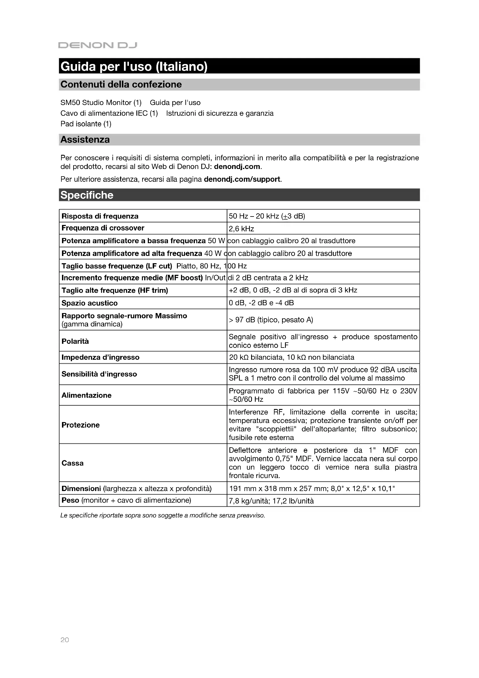 Guida per l'uso (Italiano) Contenuti della confezione SM50 Studio Monitor (1) Guida per l'uso Cavo di alimentazione IEC (1) Istruzioni di sicurezza e garanzia Pad isolante (1) Assistenza Per conoscere i requisiti di sistema completi, informazioni in merito alla compatibilità e per la registrazione del prodotto, recarsi al sito Web di Denon DJ: denondj.com. Per ulteriore assistenza, recarsi alla pagina denondj.com/support. Specifiche Risposta di frequenza 50 Hz – 20 kHz (+3 dB) Frequenza di crossover 2,6 kHz Potenza amplificatore a bassa frequenza 50 W con cablaggio calibro 20 al trasduttore Potenza amplificatore ad alta frequenza 40 W con cablaggio calibro 20 al trasduttore Taglio basse frequenze (LF cut) Piatto, 80 Hz, 100 Hz Incremento frequenze medie (MF boost) In/Out di 2 dB centrata a 2 kHz Taglio alte frequenze (HF trim) +2 dB, 0 dB, -2 dB al di sopra di 3 kHz Spazio acustico 0 dB, -2 dB e -4 dB Rapporto segnale-rumore Massimo (gamma dinamica) > 97 dB (tipico, pesato A) Polarità Segnale positivo all'ingresso + produce spostamento conico esterno LF Impedenza d’ingresso 20 kΩ bilanciata, 10 kΩ non bilanciata Sensibilità d'ingresso Ingresso rumore rosa da 100 mV produce 92 dBA uscita SPL a 1 metro con il controllo del volume al massimo Alimentazione Programmato di fabbrica per 115V ~50/60 Hz o 230V ~50/60 Hz Protezione Interferenze RF, limitazione della corrente in uscita; temperatura eccessiva; protezione transiente on/off per evitare "scoppiettii" dell'altoparlante; filtro subsonico; fusibile rete esterna Cassa Deflettore anteriore e posteriore da 1" MDF con avvolgimento 0,75" MDF. Vernice laccata nera sul corpo con un leggero tocco di vernice nera sulla piastra frontale ricurva. Dimensioni (larghezza x altezza x profondità) 191 mm x 318 mm x 257 mm; 8,0" x 12,5" x 10,1" Peso (monitor + cavo di alimentazione) 7,8 kg/unità; 17,2 lb/unità Le specifiche riportate sopra sono soggette a modifiche senza preavviso.21