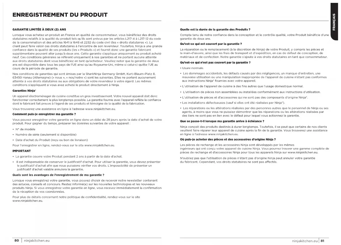 Se acquisti un prodotto in Italia come consumatore, sei titolare dei diritti di legge relativi alla qualità del prodotto (“Garanzia legale”). Puoi far valere la Garanzia legale nei confronti del rivenditore. Nonostante ciò, la fiducia di Ninja nella qualità dei propri prodotti (i “Prodotti”) è tale da portarla a fornire un’ulteriore garanzia come produttore della durata di 2 anni. La presente Garanzia convenzionale è valida solo per i Prodotti nuovi e non usati. I presenti termini e condizioni si riferiscono solo alla nostra Garanzia convenzionale; la tua Garanzia legale in qualità di acquirente rimane inalterata. Nota: i 2 anni di garanzia valgono per tutti i paesi europei e per il Regno Unito anche qualora si uscisse dall’Unione europea durante il periodo di validità. Le condizioni che seguono descrivono i prerequisiti e il campo di applicazione delle nostre garanzie che sono fornite da SharkNinja Germany GmbH, Kurt–Blaum–Platz 8, 63450 Hanau (Germania) (“noi”). Le presenti garanzie non alterano in alcun modo la Garanzia legale o gli obblighi di legge del venditore o il tuo contratto con lo stesso. Lo stesso vale se hai acquistato il prodotto direttamente da Ninja. Garanzie Ninja® Un elettrodomestico per la cucina costituisce un investimento considerevole. Il tuo nuovo apparecchio deve funzionare correttamente per il maggior tempo possibile. La garanzia di cui è provvisto è un fattore importante e riflette il grado di fiducia che il produttore ha nella qualità del proprio Prodotto e del processo di produzione. Puoi ricevere assistenza online all’indirizzo www.ninjakitchen.eu. Come devo fare per registrare la mia Garanzia convenzionale? Puoi registrare la tua Garanzia convenzionale online entro 28 giorni dall’acquisto. Per risparmiare tempo, ti informiamo che necessiterai delle seguenti informazioni relative al tuo apparecchio: