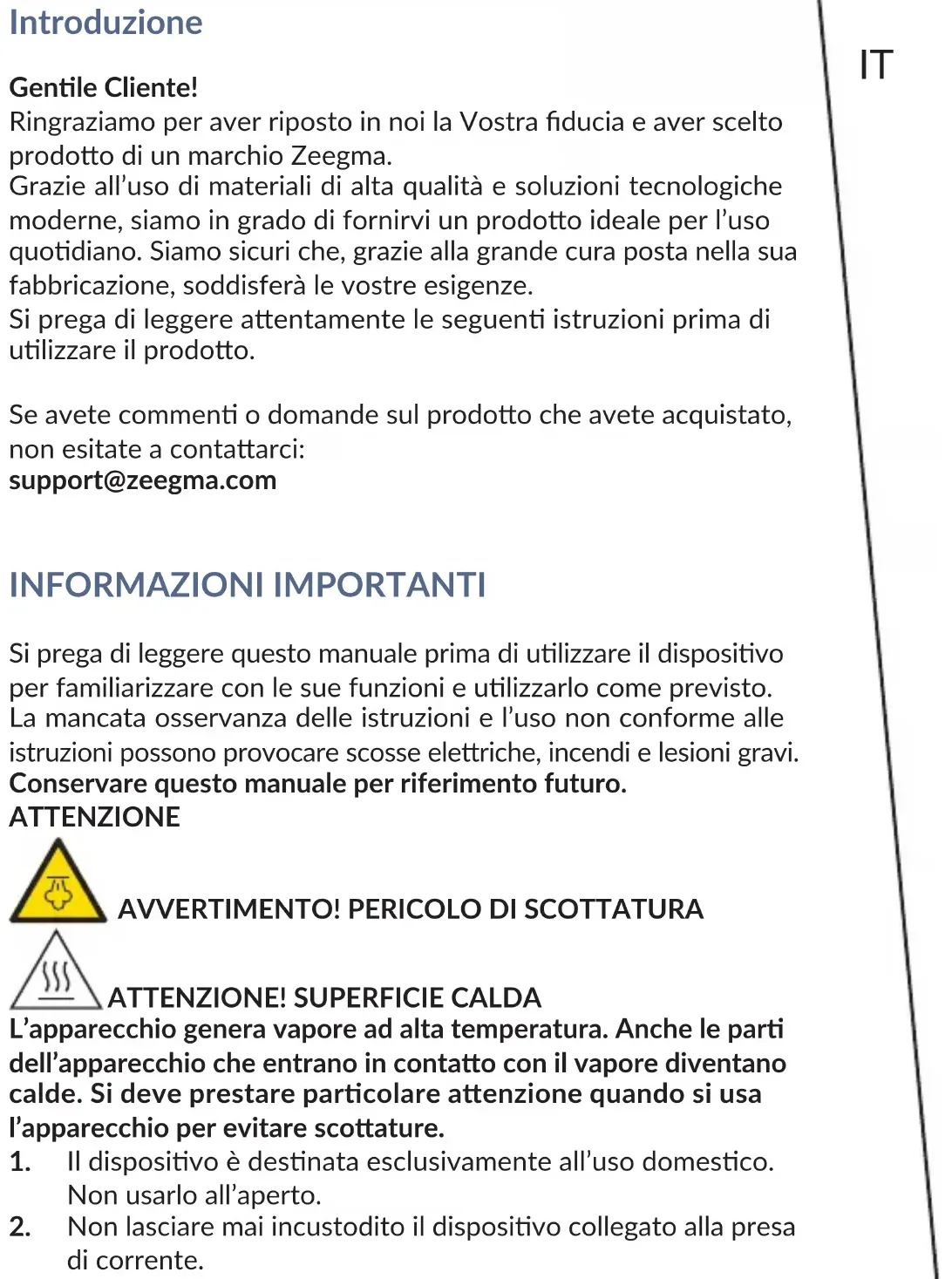 i suchą ściereczką. Zdjęcia mają charakter poglądowy, rzeczywisty wygląd produktów może się różnić od prezentowanego na zdjęciach.IT Introduzione Genle Cliente! Ringraziamo per aver riposto in noi la Vostra ducia e aver scelto prodoo di un marchio Zeegma. Grazie all’uso di materiali di alta qualità e soluzioni tecnologiche moderne, siamo in grado di fornirvi un prodoo ideale per l’uso quodiano. Siamo sicuri che, grazie alla grande cura posta nella sua fabbricazione, soddisferà le vostre esigenze. Si prega di leggere aentamente le seguen istruzioni prima di ulizzare il prodoo. Se avete commen o domande sul prodoo che avete acquistato, non esitate a contaarci: support@zeegma.com INFORMAZIONI IMPORTANTI Si prega di leggere questo manuale prima di ulizzare il disposivo per familiarizzare con le sue funzioni e ulizzarlo come previsto. La mancata osservanza delle istruzioni e l’uso non conforme alle istruzioni possono provocare scosse eleriche, incendi e lesioni gravi. Conservare questo manuale per riferimento futuro. ATTENZIONE