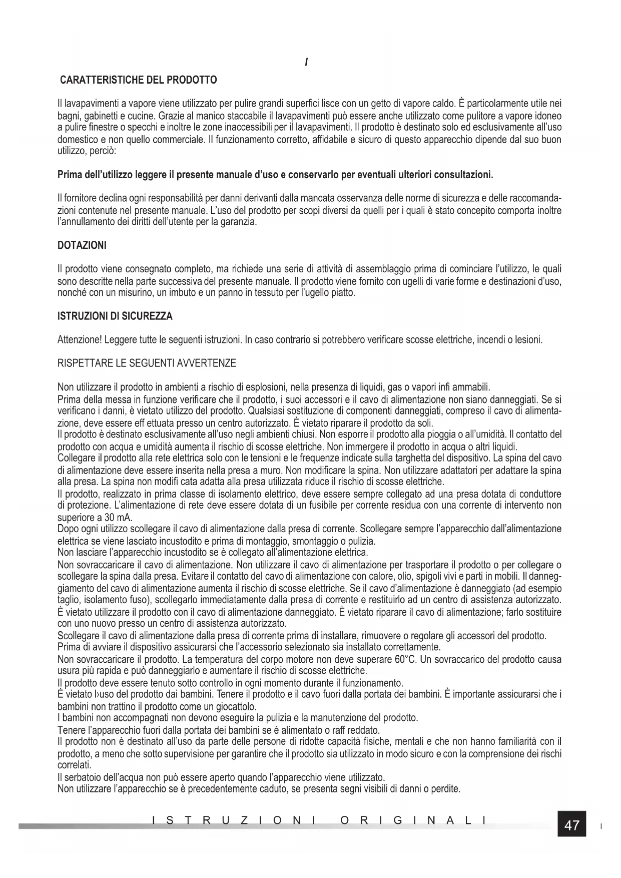 Non utilizzare il prodotto in ambienti a rischio di esplosioni, nella presenza di liquidi, gas o vapori infi ammabili. Prima della messa in funzione verifi care che il prodotto, i suoi accessori e il cavo di alimentazione non siano danneggiati. Se si verifi cano i danni, è vietato utilizzo del prodotto. Qualsiasi sostituzione di componenti danneggiati, compreso il cavo di alimenta- zione, deve essere eff ettuata presso un centro autorizzato. È vietato riparare il prodotto da soli. Il prodotto è destinato esclusivamente all’uso negli ambienti chiusi. Non esporre il prodotto alla pioggia o all’umidità. Il contatto del prodotto con acqua e umidità aumenta il rischio di scosse elettriche. Non immergere il prodotto in acqua o altri liquidi. Collegare il prodotto alla rete elettrica solo con le tensioni e le frequenze indicate sulla targhetta del dispositivo. La spina del cavo di alimentazione deve essere inserita nella presa a muro. Non modifi care la spina. Non utilizzare adattatori per adattare la spina alla presa. La spina non modifi cata adatta alla presa utilizzata riduce il rischio di scosse elettriche. Il prodotto, realizzato in prima classe di isolamento elettrico, deve essere sempre collegato ad una presa dotata di conduttore di protezione. L’alimentazione di rete deve essere dotata di un fusibile per corrente residua con una corrente di intervento non superiore a 30 mA. Dopo ogni utilizzo scollegare il cavo di alimentazione dalla presa di corrente. Scollegare sempre l’apparecchio dall’alimentazione elettrica se viene lasciato incustodito e prima di montaggio, smontaggio o pulizia. Non lasciare l’apparecchio incustodito se è collegato all’alimentazione elettrica. Non sovraccaricare il cavo di alimentazione. Non utilizzare il cavo di alimentazione per trasportare il prodotto o per collegare o scollegare la spina dalla presa. Evitare il contatto del cavo di alimentazione con calore, olio, spigoli vivi e parti in mobili. Il danneg- giamento del cavo di alimentazione aumenta il rischio di scosse elettriche. Se il cavo d’alimentazione è danneggiato (ad esempio taglio, isolamento fuso), scollegarlo immediatamente dalla presa di corrente e restituirlo ad un centro di assistenza autorizzato. È vietato utilizzare il prodotto con il cavo di alimentazione danneggiato. È vietato riparare il cavo di alimentazione; farlo sostituire con uno nuovo presso un centro di assistenza autorizzato. Scollegare il cavo di alimentazione dalla presa di corrente prima di installare, rimuovere o regolare gli accessori del prodotto. Prima di avviare il dispositivo assicurarsi che l’accessorio selezionato sia installato correttamente. Non sovraccaricare il prodotto. La temperatura del corpo motore non deve superare 60°C. Un sovraccarico del prodotto causa usura più rapida e può danneggiarlo e aumentare il rischio di scosse elettriche. Il prodotto deve essere tenuto sotto controllo in ogni momento durante il funzionamento. Ė vietato l›uso del prodotto dai bambini. Tenere il prodotto e il cavo fuori dalla portata dei bambini. È importante assicurarsi che i bambini non trattino il prodotto come un giocattolo. I bambini non accompagnati non devono eseguire la pulizia e la manutenzione del prodotto. Tenere l’apparecchio fuori dalla portata dei bambini se è alimentato o raff reddato. Il prodotto non è destinato all’uso da parte delle persone di ridotte capacità fi siche, mentali e che non hanno familiarità con il prodotto, a meno che sotto supervisione per garantire che il prodotto sia utilizzato in modo sicuro e con la comprensione dei rischi correlati. Il serbatoio dell’acqua non può essere aperto quando l’apparecchio viene utilizzato. Non utilizzare l’apparecchio se è precedentemente caduto, se presenta segni visibili di danni o perdite.48 ISTRUZIONI ORIGINALI