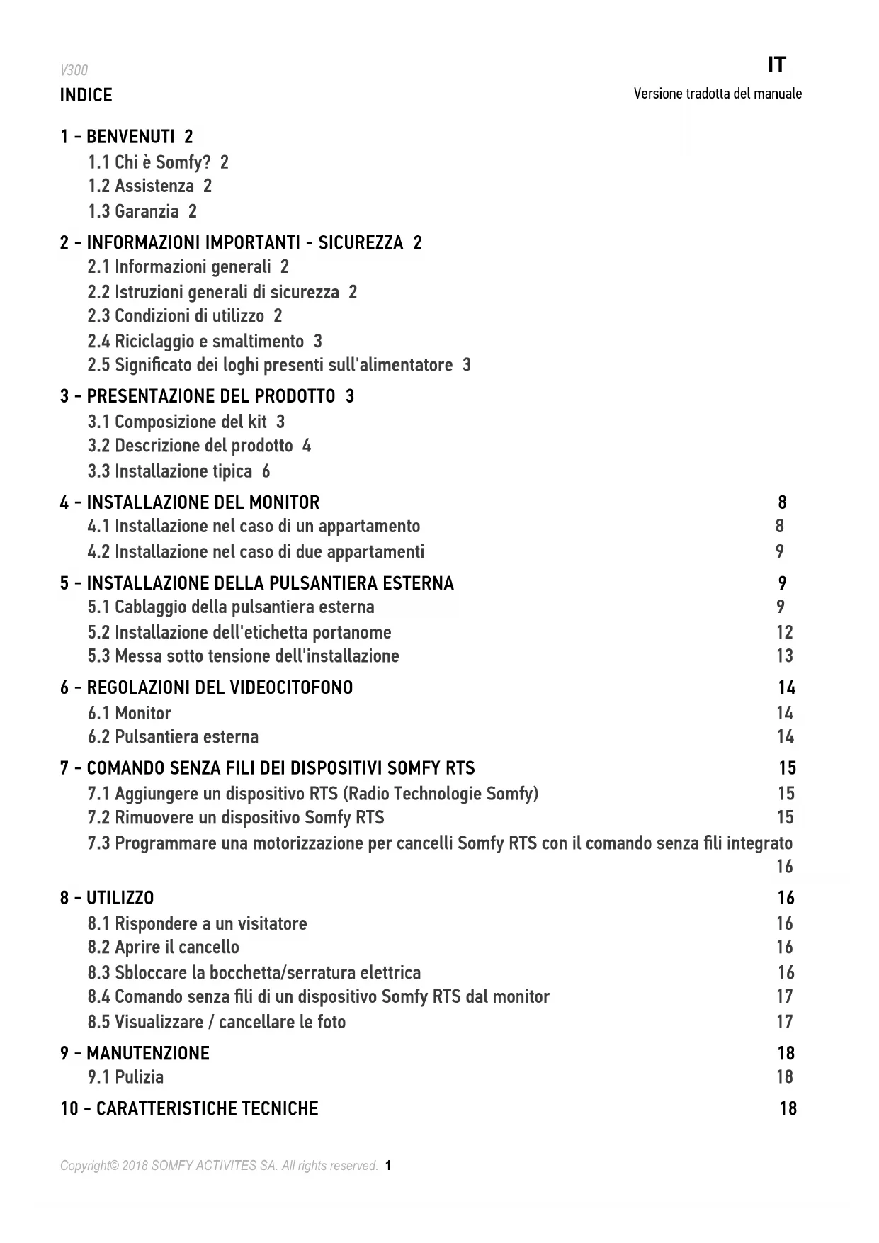 La portata radio è limitata dalle normative che disciplinano il funzionamento degli apparecchi radio. La portata radio dipende in larga misura dall'ambiente di utilizzo: possibili perturbazioni a opera di grandi apparecchiature elettriche nelle vicinanze dell'installazione, tipo di materiale impiegato nei muri e nelle tramezze del luogo di installazione. L’impiego di apparecchi radio (ad esempio, cuffie radio hi-fi) che si servono della stessa frequenza radio può ridurre le prestazioni del prodotto. La telecamera di questo videocitofono è stata concepita allo scopo di identificare un visitatore, ma non deve essere impiegata per la sorveglianza di strade o spazi pubblici. Questo impianto deve essere utilizzato in conformità alla Legge sull'informatica e sulle libertà. Qualsiasi utilizzo del prodotto al di fuori di un contesto strettamente personale è soggetto a obblighi legali di utilizzo, ed è inoltre soggetto all'ottenimento di preventive autorizzazioni amministrative. L’acquirente potrebbe trovarsi nella condizione di dover rispondere di responsabilità civili e penali in caso di un impiego anomalo del dispositivo volto allo scopo di violare l'intimità della vita privata o l'immagine di terzi; Somfy non potrà, in alcun caso, essere ritenuta responsabile per un utilizzo del videocitofono che contravvenga alle disposizioni legislative e normative in vigore.Copyright© 2018 SOMFY ACTIVITES SA. All rights reserved. 3 V300