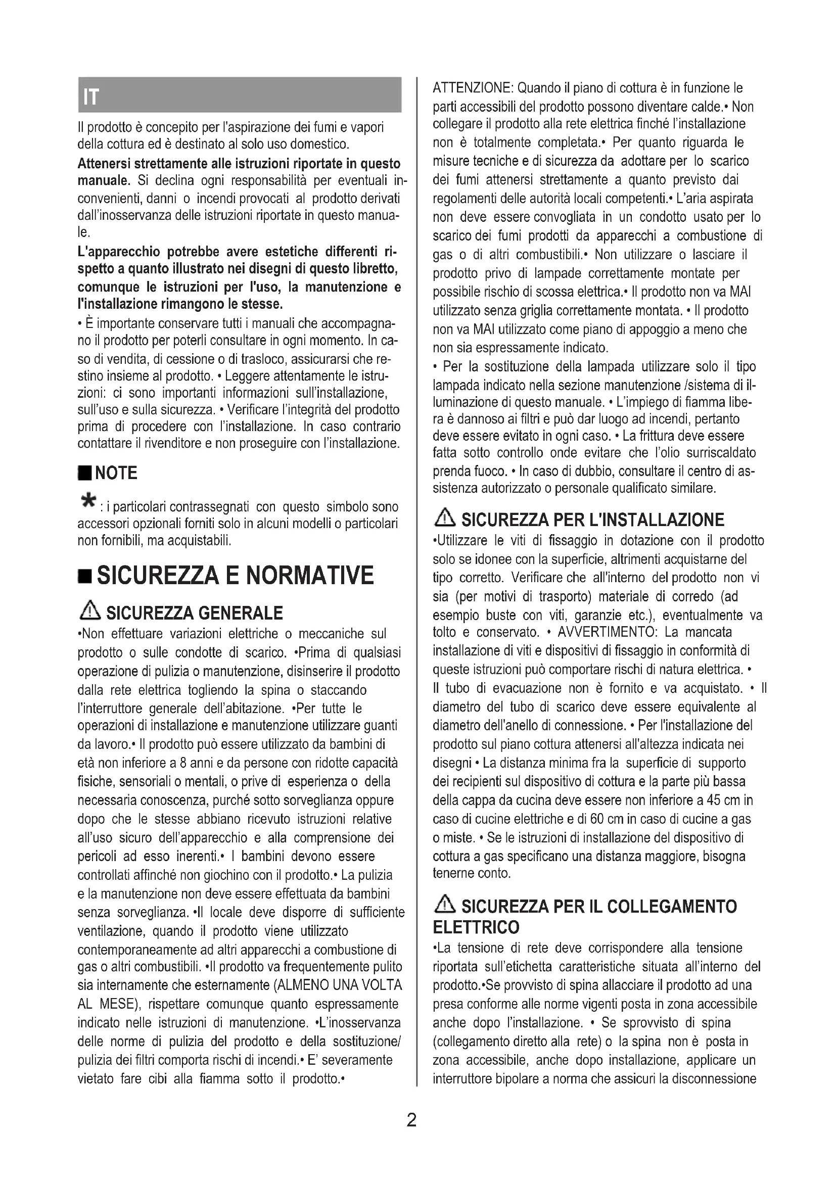 - Non effettuare variazioni elettriche o meccaniche sul prodotto o sulle condotte di scarico. •Prima di qualsiasi operazione di pulizia o manutenzione, disinserire il prodotto dalla rete elettrica togliendo la spina o staccando l’interruttore generale dell’abitazione. •Per tutte le operazioni di installazione e manutenzione utilizzare guanti da lavoro.• Il prodotto può essere utilizzato da bambini di età non inferiore a 8 anni e da persone con ridotte capacità fisiche, sensoriali o mentali, o prive di esperienza o della necessaria conoscenza, purché sotto sorveglianza oppure dopo che le stesse abbiano ricevuto istruzioni relative all’uso sicuro dell’apparecchio e alla comprensione dei pericoli ad esso inerenti.• I bambini devono essere controllati affinché non giochino con il prodotto.• La pulizia e la manutenzione non deve essere effettuata da bambini senza sorveglianza. •Il locale deve disporre di sufficiente ventilazione, quando il prodotto viene utilizzato contemporaneamente ad altri apparecchi a combustione di gas o altri combustibili. •Il prodotto va frequentemente pulito sia internamente che esternamente (ALMENO UNA VOLTA AL MESE), rispettare comunque quanto espressamente indicato nelle istruzioni di manutenzione. •L’inosservanza delle norme di pulizia del prodotto e della sostituzione/ pulizia dei filtri comporta rischi di incendi.• E’ severamente vietato fare cibi alla fiamma sotto il prodotto.• ATTENZIONE: Quando il piano di cottura è in funzione le parti accessibili del prodotto possono diventare calde.• Non collegare il prodotto alla rete elettrica finché l’installazione non è totalmente completata.• Per quanto riguarda le misure tecniche e di sicurezza da adottare per lo scarico dei fumi attenersi strettamente a quanto previsto dai regolamenti delle autorità locali competenti.• L’aria aspirata non deve essere convogliata in un condotto usato per lo scarico dei fumi prodotti da apparecchi a combustione di gas o di altri combustibili.• Non utilizzare o lasciare il prodotto privo di lampade correttamente montate per possibile rischio di scossa elettrica.• Il prodotto non va MAI utilizzato senza griglia correttamente montata. • Il prodotto non va MAI utilizzato come piano di appoggio a meno che non sia espressamente indicato.