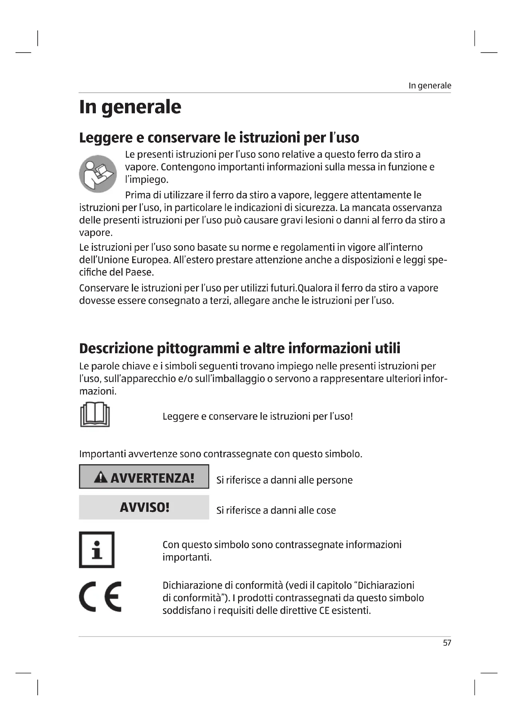 In generale/Sicurezza Attenzione! Durante l’uso le superfici diventano calde. Il sigillo Intertek conferma che l’apparecchio è sicuro per l’uso conforme. Il sigillo di controllo GS: “Geprüfte Sicherheit” (a norma di sicurezza) conferma la conformità dell’apparecchio alla norma- tiva sulla sicurezza dei prodotti. Questo simbolo segnala le normative specifiche per lo smaltimen- to di vecchi apparecchi (vedi il capitolo “Smaltimento”). Sicurezza Utilizzo conforme alla destinazione d’uso L’apparecchio è destinato esclusivamente alla stiratura di capi di abbigliamento e biancheria. È idoneo per l’uso solo in am- bienti chiusi asciutti. Inoltre, l’apparecchio non è destinato a impieghi industriali ma soltanto all’utilizzo in abitazioni pri- vate. Qualsiasi altro utilizzo o modifica dell’apparecchio non è appropriato ed è in linea di principio proibito. Si declina qualsi- asi responsabilità per eventuali danni derivanti da un uso non corretto o erroneo. Questo prodotto è classificato come appa- recchio accessibile al pubblico generale.5959 Sicurezza Note relative alla sicurezza AVVERTENZA! Leggere e osservare tutte le indicazioni per la sicurezza riportate di seguito. La mancata osservanza comporta notevoli rischi di incidenti e lesioni e il pericolo di danni materiali e all’apparecchio. Pericoli per bambini e persone con capacità limitate - L’apparecchio può essere utilizzato dai bambini a partire da- gli 8anni e da persone con ridotte capacità fisiche, sensoriali o mentali o con scarsa esperienza e/o inesperte solo se sor- vegliati o informati in merito all’uso sicuro dell’apparecchio e ai pericoli conseguenti. - La pulizia e la manutenzione da parte dell’utente non pos- sono essere eseguite da bambini. Durante l’accensione o il raffreddamento, il ferro da stiro e il suo cavo di collegamento devono essere tenuti fuori dalla portata dei bambini di età inferiore agli 8 anni. - I bambini non devono giocare con l’apparecchio. I bambini non conoscono i pericoli che possono derivare dall’uso di apparecchi elettrici. Per questo motivo l’apparecchio deve essere usato e conservato lontano dalla portata dei bambi- ni di età inferiore a 8anni. Non lasciar penzolare il cavo di alimentazione per evitare di inciamparvi. - Tenere il materiale di imballaggio fuori dalla portata dei bambini. Pericolo di soffocamento!60 Sicurezza Pericoli durante l’uso degli apparecchi elettrici - Collegare l’apparecchio solo a una presa di corrente con contatto di terra installata a norma, con tensione di rete come da targhetta identificativa. - Se il cavo di alimentazione di rete di questo apparecchio è danneggiato, deve essere sostituito dal produttore o dal suo servizio clienti o da una persona di qualifica analoga per evitare pericoli. - In caso di danneggiamento del cavo di alimentazione, la sostituzione deve essere effettuata esclusivamente da un laboratorio specializzato indicato dal costruttore per evitare pericoli di ferimento e incidenti nonché danni all’apparec- chio. - Le riparazioni devono essere eseguite solo da laboratori specializzati e autorizzati. Le apparecchiature non riparate a regola d’arte sono pericolose per chi le utilizza. - Per evitare incidenti tenere sempre sotto controllo l’appa- recchio quando è in funzione. - Per evitare incidenti, non collegare mai più elettrodome- stici contemporaneamente (ad es. tramite una presa tripla) alla stessa presa con contatto di terra. - Non immergere mai l’apparecchio, il cavo di alimentazione e la spina in acqua. Assicurarsi che l’acqua penetri solo nell’ap- posito serbatoio. Non deve penetrare alcun liquido all’inter- no dell’alloggiamento. - Non utilizzare l’apparecchio all’aperto, poiché potrebbe es- sere esposto alla pioggia o all’umidità. Pericolo di scossa elettrica! - Se l’apparecchio dovesse cadere nell’acqua, staccare per prima cosa la spina ed estrarre l’apparecchio dall’acqua! Dopodiché non rimettere in funzione l’apparecchio, ma farlo prima controllare da un centro di assistenza autorizzato. Ciò vale anche in caso di danneggiamento del cavo di alimenta-61 Sicurezza Attenzione! Superficie calda! zione o dell’apparecchio e di caduta dell’apparecchio. Pericolo di scossa elettrica! - Staccare sempre la spina dalla presa di corrente quando non si usa l’apparecchio e prima di qualsiasi operazione di pulizia o in caso di problemi nel funzionamento e di temporale! Non tirare mai il cavo di alimentazione! Pericolo di scossa elettrica! - Fare attenzione a che il cavo di alimentazione o l’apparec- chio non siano mai collocati su superfici calde o in prossi- mità di fonti di calore. Sistemare il cavo di alimentazione in modo che non entri in contatto con oggetti bollenti o affila- ti. Pericolo di scossa elettrica! - Non piegare assolutamente il cavo di alimentazione e non avvolgerlo intorno all’apparecchio in quanto ciò potrebbe causare la rottura del cavo. Pericolo di scossa elettrica! - Non usare l’apparecchio sul pavimento bagnato o con le mani bagnate o se l’apparecchio stesso è umido. Pericolo di scossa elettrica! - Non aprire mai l’apparecchio e non cercare in alcun modo di raggiungerne l’interno con oggetti metallici. Pericolo di scossa elettrica! Pericoli durante l’uso del ferro da stiro a vapore