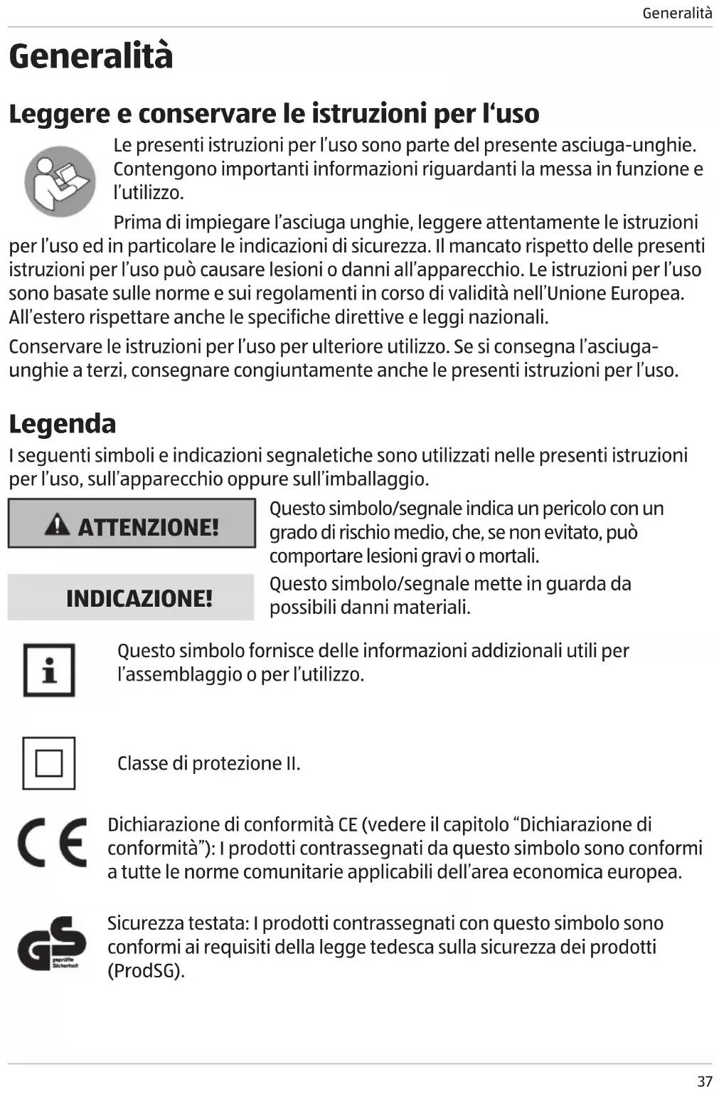 Generalità Leggere e conservare le istruzioni per l‘uso Le presenti istruzioni per l’uso sono parte del presente asciuga-unghie. Contengono importanti informazioni riguardanti la messa in funzione e l’utilizzo. Prima di impiegare l’asciuga unghie, leggere attentamente le istruzioni per l’uso ed in particolare le indicazioni di sicurezza. Il mancato rispetto delle presenti istruzioni per l’uso può causare lesioni o danni all’apparecchio. Le istruzioni per l’uso sono basate sulle norme e sui regolamenti in corso di validità nell’Unione Europea. All’estero rispettare anche le specifiche direttive e leggi nazionali. Conservare le istruzioni per l’uso per ulteriore utilizzo. Se si consegna l’asciuga- unghie a terzi, consegnare congiuntamente anche le presenti istruzioni per l’uso. Legenda I seguenti simboli e indicazioni segnaletiche sono utilizzati nelle presenti istruzioni per l’uso, sull’apparecchio oppure sull’imballaggio. ATTENZIONE! Questo simbolo/segnale indica un pericolo con un grado di rischio medio, che, se non evitato, può comportare lesioni gravi o mortali. INDICAZIONE! Questo simbolo/segnale mette in guarda da possibili danni materiali. Questo simbolo fornisce delle informazioni addizionali utili per l’assemblaggio o per l’utilizzo. Classe di protezione II. Dichiarazione di conformità CE (vedere il capitolo “Dichiarazione di conformità”): I prodotti contrassegnati da questo simbolo sono conformi a tutte le norme comunitarie applicabili dell’area economica europea. Sicurezza testata: I prodotti contrassegnati con questo simbolo sono conformi ai requisiti della legge tedesca sulla sicurezza dei prodotti (ProdSG).Sicurezza