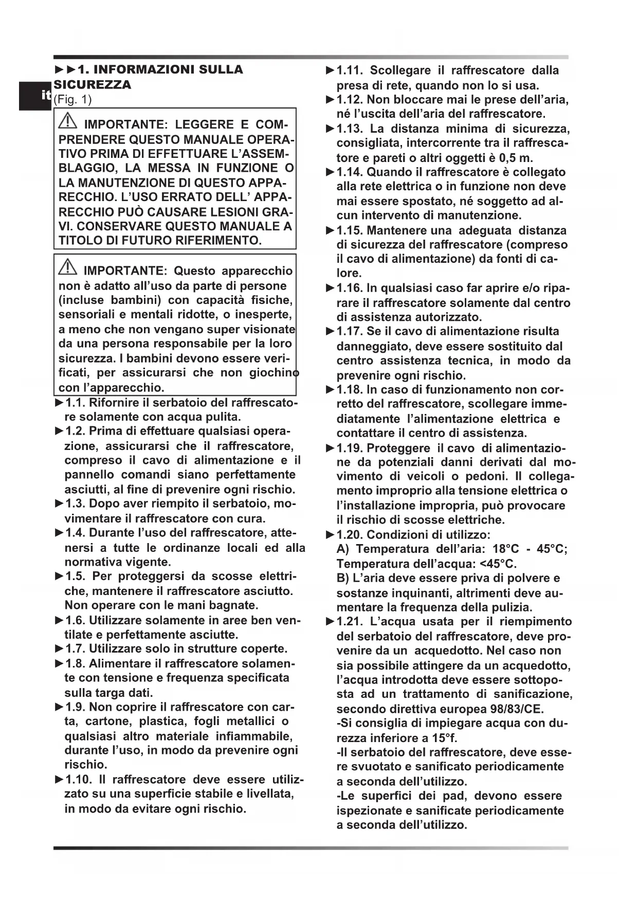 TITOLO DI FUTURO RIFERIMENTO. IMPORTANTE: Questo apparecchio non è adatto all’uso da parte di persone (incluse bambini) con capacità siche, sensoriali e mentali ridotte, o inesperte, a meno che non vengano super visionate da una persona responsabile per la loro sicurezza. I bambini devono essere veri- cati, per assicurarsi che non giochino con l’apparecchio. ►1.1. Rifornire il serbatoio del rarescato- re solamente con acqua pulita. ►1.2. Prima di eettuare qualsiasi opera- zione, assicurarsi che il rarescatore, compreso il cavo di alimentazione e il pannello comandi siano perfettamente asciutti, al ne di prevenire ogni rischio. ►1.3. Dopo aver riempito il serbatoio, mo- vimentare il rarescatore con cura. ►1.4. Durante l’uso del rarescatore, atte- nersi a tutte le ordinanze locali ed alla normativa vigente. ►1.5. Per proteggersi da scosse elettri- che, mantenere il rarescatore asciutto. Non operare con le mani bagnate. ►1.6. Utilizzare solamente in aree ben ven- tilate e perfettamente asciutte. ►1.7. Utilizzare solo in strutture coperte. ►1.8. Alimentare il rarescatore solamen- te con tensione e frequenza specicata sulla targa dati. ►1.9. Non coprire il rarescatore con car- ta, cartone, plastica, fogli metallici o qualsiasi altro materiale inammabile, durante l’uso, in modo da prevenire ogni rischio. ►1.10. Il rarescatore deve essere utiliz- zato su una supercie stabile e livellata, in modo da evitare ogni rischio. ►1.11. Scollegare il rarescatore dalla presa di rete, quando non lo si usa. ►1.12. Non bloccare mai le prese dell’aria, né l’uscita dell’aria del rarescatore. ►1.13. La distanza minima di sicurezza, consigliata, intercorrente tra il raresca- tore e pareti o altri oggetti è 0,5 m. ►1.14. Quando il rarescatore è collegato alla rete elettrica o in funzione non deve mai essere spostato, né soggetto ad al- cun intervento di manutenzione. ►1.15. Mantenere una adeguata distanza di sicurezza del rarescatore (compreso il cavo di alimentazione) da fonti di ca- lore. ►1.16. In qualsiasi caso far aprire e/o ripa- rare il rarescatore solamente dal centro di assistenza autorizzato. ►1.17. Se il cavo di alimentazione risulta danneggiato, deve essere sostituito dal centro assistenza tecnica, in modo da prevenire ogni rischio. ►1.18. In caso di funzionamento non cor- retto del rarescatore, scollegare imme- diatamente l’alimentazione elettrica e contattare il centro di assistenza. ►1.19. Proteggere il cavo di alimentazio- ne da potenziali danni derivati dal mo- vimento di veicoli o pedoni. Il collega- mento improprio alla tensione elettrica o l’installazione impropria, può provocare il rischio di scosse elettriche. ►1.20. Condizioni di utilizzo: A) Temperatura dell’aria: 18°C - 45°C; Temperatura dell’acqua: <45°C. B) L’aria deve essere priva di polvere e sostanze inquinanti, altrimenti deve au- mentare la frequenza della pulizia. ►1.21. L’acqua usata per il riempimento del serbatoio del rarescatore, deve pro- venire da un acquedotto. Nel caso non sia possibile attingere da un acquedotto, l’acqua introdotta deve essere sottopo- sta ad un trattamento di sanicazione, secondo direttiva europea 98/83/CE. -Si consiglia di impiegare acqua con du- rezza inferiore a 15°f. -Il serbatoio del rarescatore, deve esse- re svuotato e sanicato periodicamente a seconda dell’utilizzo. -Le superci dei pad, devono essere ispezionate e sanicate periodicamente a seconda dell’utilizzo. it-Per le operazioni di sanicazione, de- vono essere impiegati prodotti bioci- di conformi al regolamento europeo n° 582/2012. ►►2. DISIMBALLAGGIO ►2.1. Rimuovere tutti i materiali di imballag- gio usati per confezionare e spedire il rare- scatore e smaltirli secondo le norme vigenti. ►2.2. Estrarre tutti gli articoli dall’imballo. ►2.3. Controllare eventuali danni subiti du- rante il trasporto. Se il rarescatore appare danneggiato, informare immediatamente il concessionario presso il quale è stato ac- quistato. ►►3. ASSEMBLAGGIO Il rarescatore è dotato di kit di canalizzazione dell’aria e di ruote per agevolare la movimen- tazione. A seconda del modello, tutti i com- ponenti si possono trovare installati, oppure sono da installare. I componenti, completi del- la relativa bulloneria di montaggio, sono situa- ti all’interno dell’imballo (Fig. 2). ►►4. FUNZIONAMENTO AVVERTENZA: Leggere attentamente le ”INFORMAZIONI SULLA SICUREZZA”, prima di accendere il rarescatore. AVVERTENZA: Usare solamente acqua pulita, per evitare guasti o altre anomalie. AVVERTENZA: Vericare la corretta messa a terra del vostro impianto elettri- co. Il collegamento alla rete elettrica va fatto in accordo con le norme nazionali vigenti. Alimentare il rarescatore sola- mente con tensione e frequenza speci- cata sulla targa dati. ►►4.1. ACCENSIONE: ►4.1.1. Collegare il rarescatore alla rete id- rica tramite il raccordo lettato (Fig. 3). ►4.1.2. Rifornire d’acqua il serbatoio. Quan- do il serbatoio raggiunge il massimo livello, un galleggiante bloccherà automaticamen- te il usso di acqua. ATTENZIONE: È possibile far funzionare il rarescatore collegato, ed alimentato in continuo alla rete idrica. ►4.1.3. Vericare che non ci siano perdite durante il rifornimento. ►4.1.4. Collegare la spina di alimentazione alla rete elettrica (Fig. 4). ►4.1.5. Premere il pulsante ON/OFF / PO- WER per accendere il rarescatore (Fig. 6).