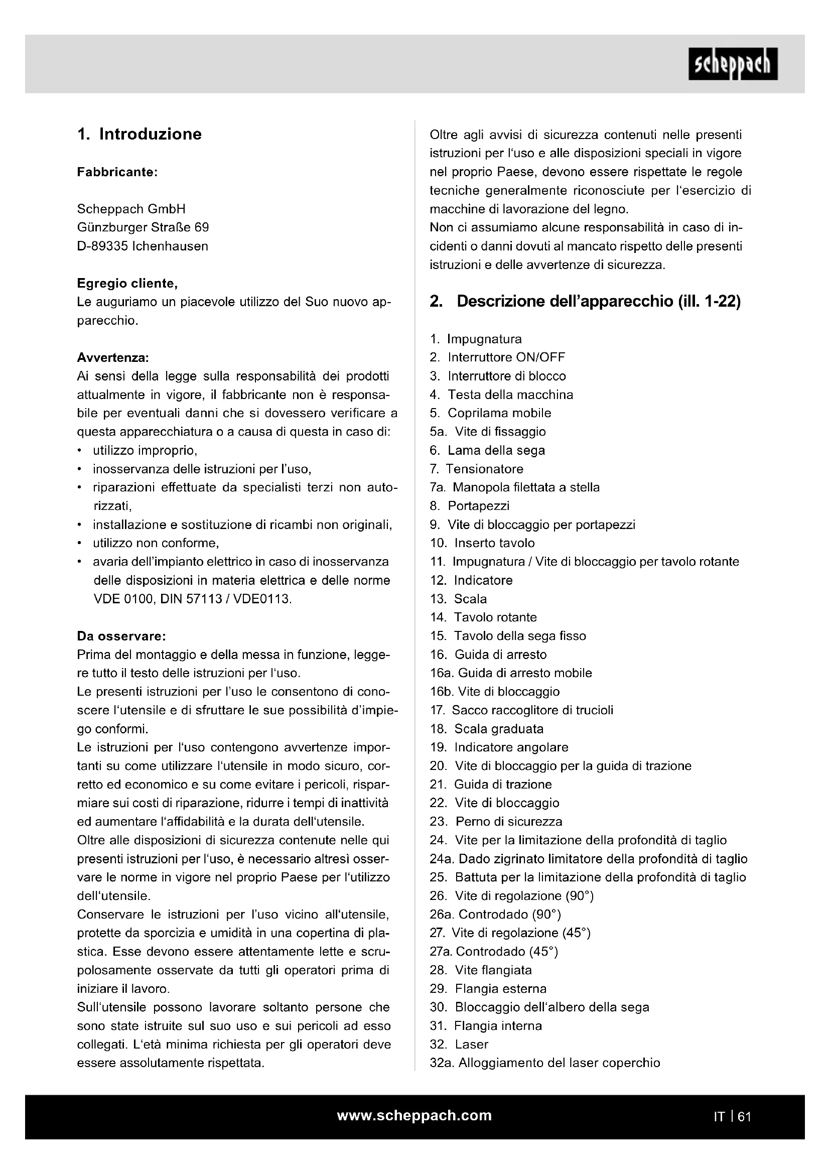 - avaria dell’impianto elettrico in caso di inosservanza delle disposizioni in materia elettrica e delle norme VDE 0100, DIN 57113 / VDE0113. Da osservare: Prima del montaggio e della messa in funzione, legge- re tutto il testo delle istruzioni per l‘uso. Le presenti istruzioni per l’uso le consentono di cono- scere l‘utensile e di sfruttare le sue possibilità d’impie- go conformi. Le istruzioni per l‘uso contengono avvertenze impor- tanti su come utilizzare l‘utensile in modo sicuro, cor- retto ed economico e su come evitare i pericoli, rispar- miare sui costi di riparazione, ridurre i tempi di inattività ed aumentare l‘adabilità e la durata dell‘utensile. Oltre alle disposizioni di sicurezza contenute nelle qui presenti istruzioni per l‘uso, è necessario altresì osser- vare le norme in vigore nel proprio Paese per l‘utilizzo dell‘utensile. Conservare le istruzioni per l’uso vicino all‘utensile, protette da sporcizia e umidità in una copertina di pla- stica. Esse devono essere attentamente lette e scru- polosamente osservate da tutti gli operatori prima di iniziare il lavoro. Sull‘utensile possono lavorare soltanto persone che sono state istruite sul suo uso e sui pericoli ad esso collegati. L‘età minima richiesta per gli operatori deve essere assolutamente rispettata.www.scheppach.com