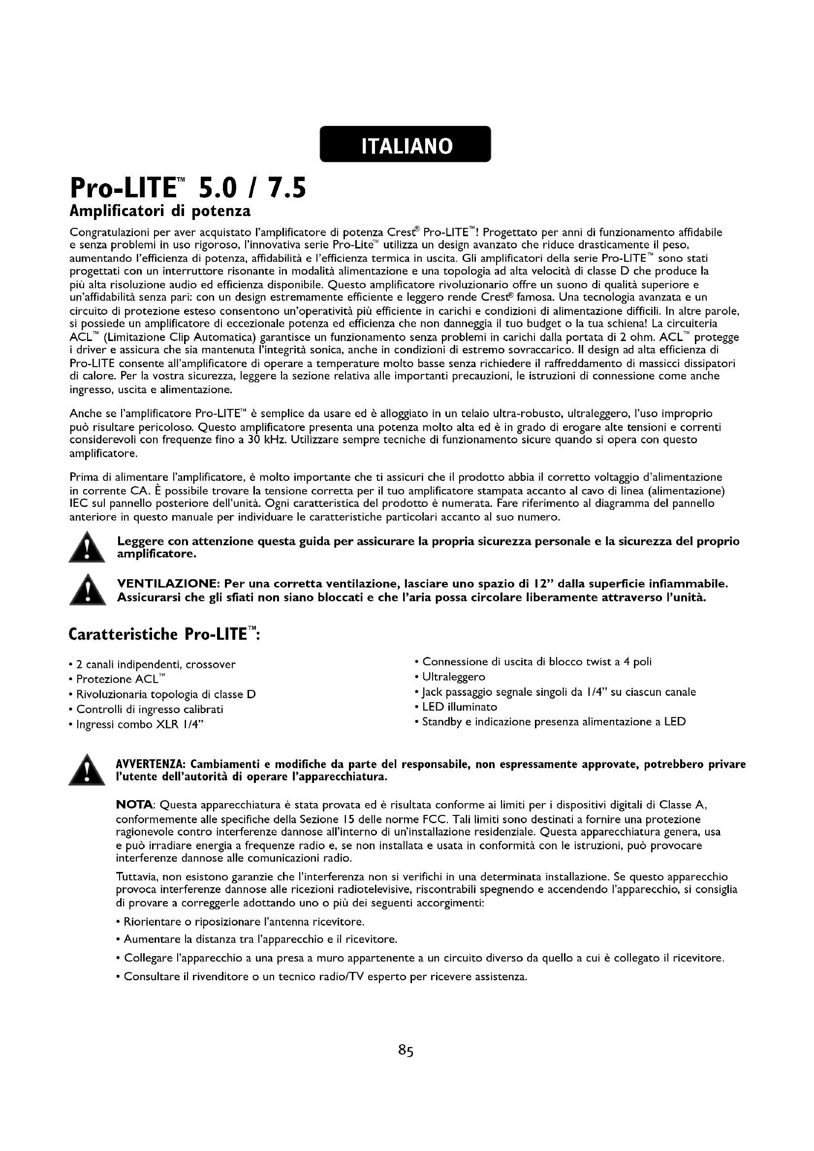 protegge i driver e assicura che sia mantenuta l’integrità sonica, anche in condizioni di estremo sovraccarico. Il design ad alta efficienza di Pro-LITE consente all’amplificatore di operare a temperature molto basse senza richiedere il raffreddamento di massicci dissipatori di calore. Per la vostra sicurezza, leggere la sezione relativa alle importanti precauzioni, le istruzioni di connessione come anche ingresso, uscita e alimentazione. Anche se l’amplificatore Pro-LITE