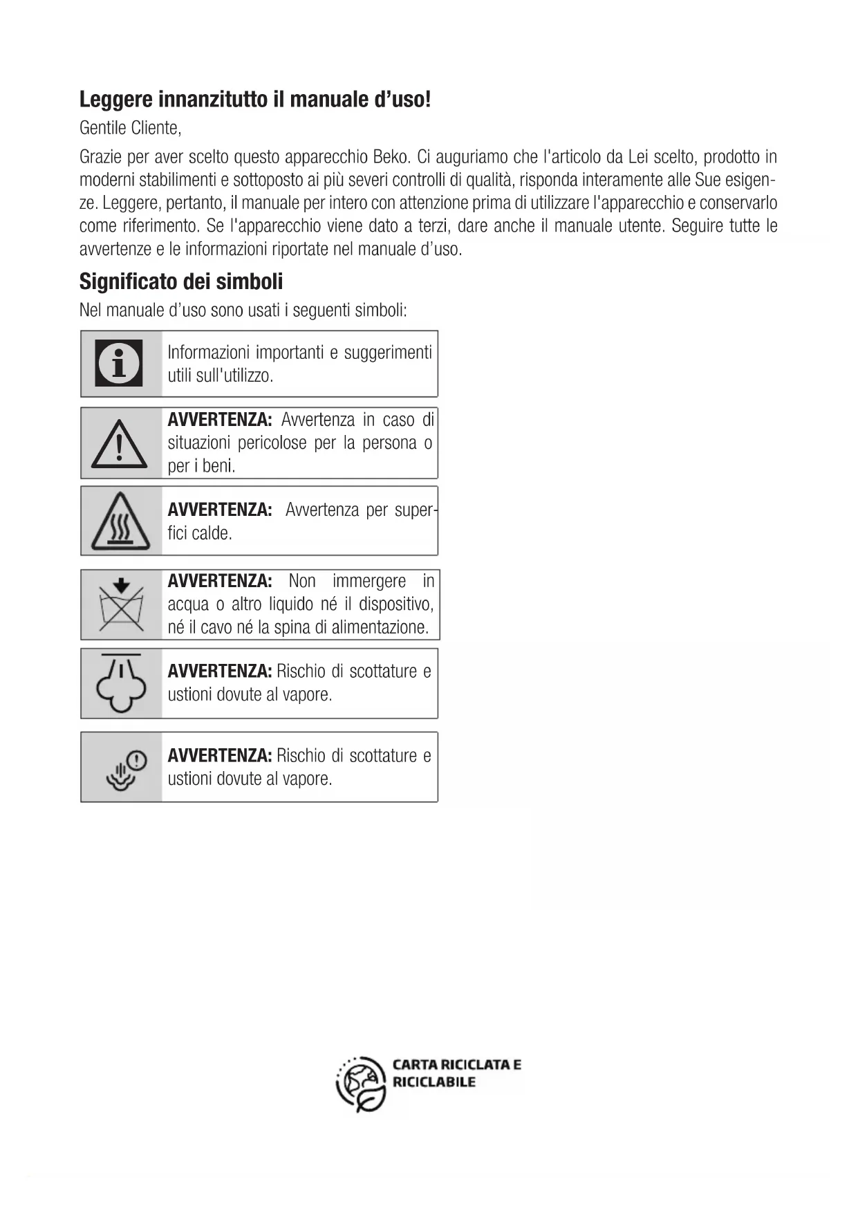 AVVERTENZA: Avvertenza in caso di situazioni pericolose per la persona o per i beni. AVVERTENZA: Avvertenza per super- fici calde. AVVERTENZA: Non immergere in acqua o altro liquido né il dispositivo, né il cavo né la spina di alimentazione. AVVERTENZA: Rischio di scottature e ustioni dovute al vapore. AVVERTENZA: Rischio di scottature e ustioni dovute al vapore.Generatore di vapore / Manuale utente 67 / IT Questa sezione contiene istruzio- ni di sicurezza che consentono di prevenire il pericolo di lesioni per- sonali o di danni materiali. L’inosservanza di queste istruzio- ni invalida la garanzia accordata.