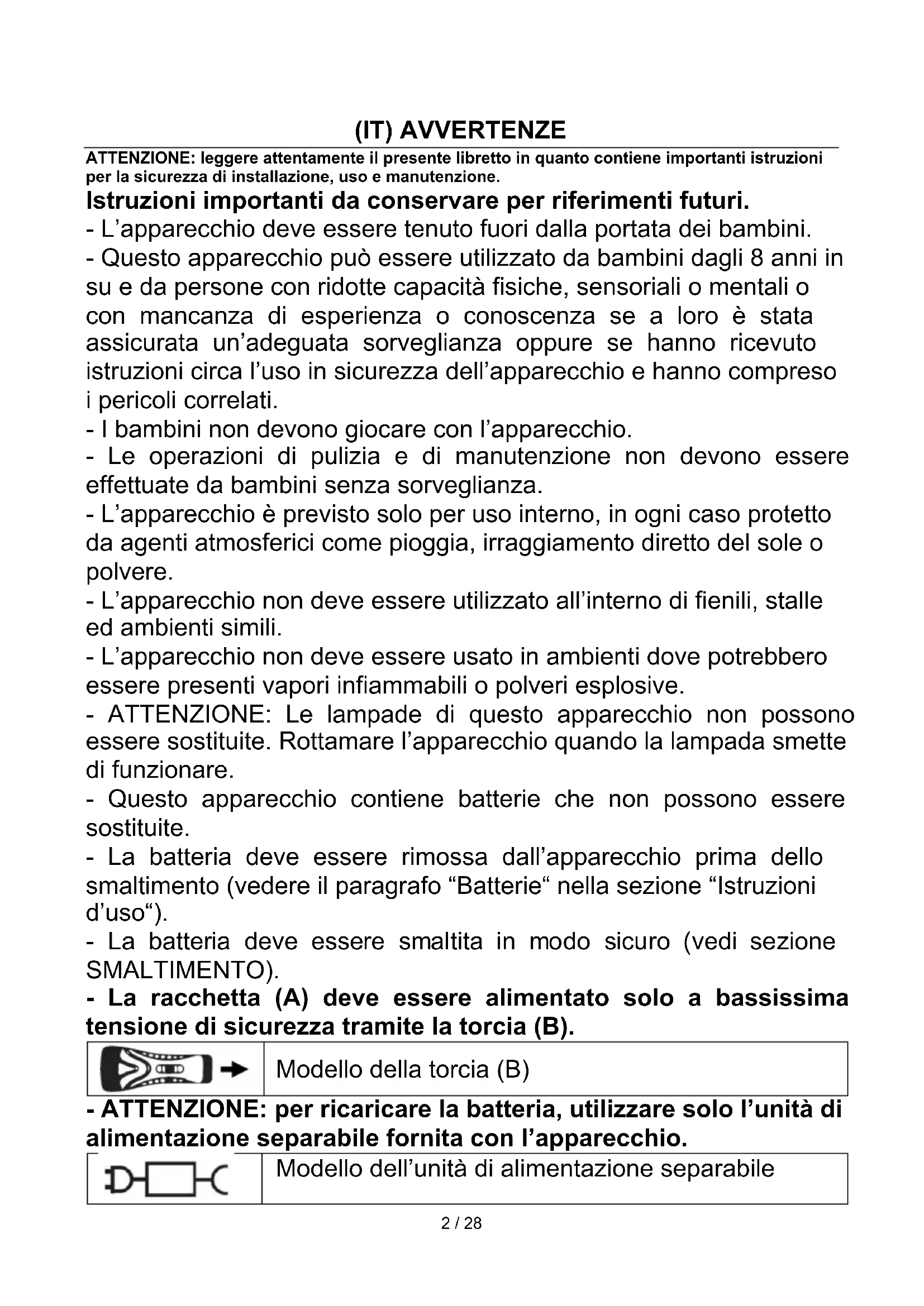 (IT) AVVERTENZE ATTENZIONE: leggere attentamente il presente libretto in quanto contiene importanti istruzioni per la sicurezza di installazione, uso e manutenzione. Istruzioni importanti da conservare per riferimenti futuri. - L’apparecchio deve essere tenuto fuori dalla portata dei bambini. - Questo apparecchio può essere utilizzato da bambini dagli 8 anni in su e da persone con ridotte capacità fisiche, sensoriali o mentali o con mancanza di esperienza o conoscenza se a loro è stata assicurata un’adeguata sorveglianza oppure se hanno ricevuto istruzioni circa l’uso in sicurezza dell’apparecchio e hanno compreso i pericoli correlati. - I bambini non devono giocare con l’apparecchio. - Le operazioni di pulizia e di manutenzione non devono essere effettuate da bambini senza sorveglianza. - L’apparecchio è previsto solo per uso interno, in ogni caso protetto da agenti atmosferici come pioggia, irraggiamento diretto del sole o polvere. - L’apparecchio non deve essere utilizzato all’interno di fienili, stalle ed ambienti simili. - L’apparecchio non deve essere usato in ambienti dove potrebbero essere presenti vapori infiammabili o polveri esplosive. - ATTENZIONE: Le lampade di questo apparecchio non possono essere sostituite. Rottamare l’apparecchio quando la lampada smette di funzionare. - Questo apparecchio contiene batterie che non possono essere sostituite. - La batteria deve essere rimossa dall’apparecchio prima dello smaltimento (vedere il paragrafo “Batterie“ nella sezione “Istruzioni d’uso“). - La batteria deve essere smaltita in modo sicuro (vedi sezione SMALTIMENTO). - La racchetta (A) deve essere alimentato solo a bassissima tensione di sicurezza tramite la torcia (B).