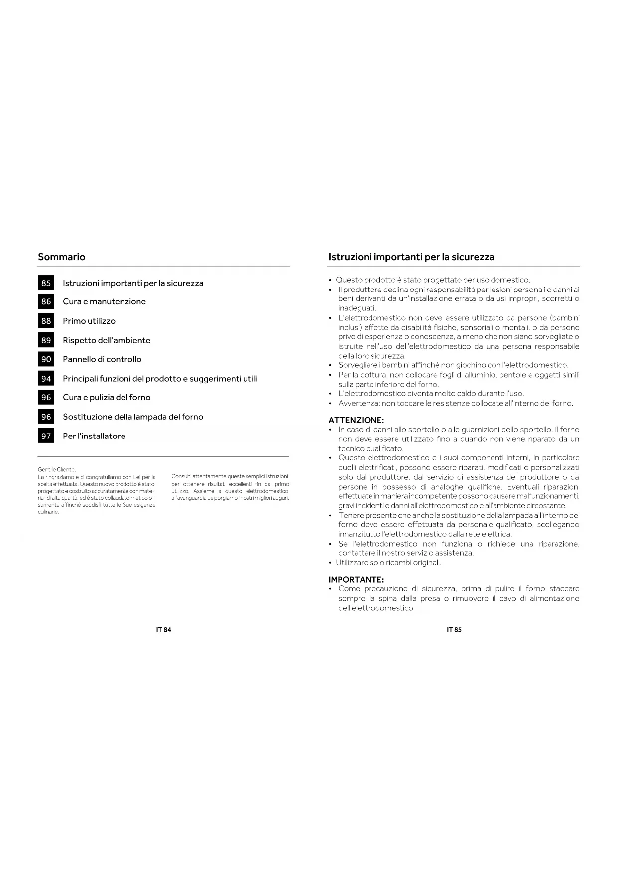 Gentile Cliente, La ringraziamo e ci congratuliamo con Lei per la scelta effettuata. Questo nuovo prodotto è stato progettato e costruito accuratamente con mate-riali di alta qualità, ed è stato collaudato meticolo-samente affinché soddisfi tutte le Sue esigenze culinarie. Consulti attentamente queste semplici istruzioni per ottenere risultati eccellenti fin dal primo utilizzo. Assieme a questo elettrodomestico all'avanguardia Le porgiamo i nostri migliori auguri. IT 85 Istruzioni importanti per la sicurezza