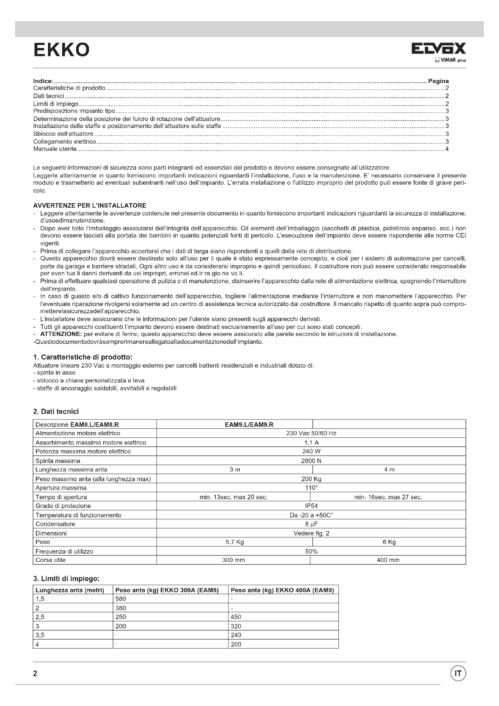 Descrizione EAM8.L/EAM8.R EAM9.L/EAM9.R Alimentazione motore elettrico 230 Vac 50/60 Hz Assorbimento massimo motore elettrico 1,1 A Potenza massima motore elettrico 240 W Spinta massima 2800 N Lunghezza massima anta 3 m 4 m Peso massimo anta (alla lunghezza max) 200 Kg Apertura massima 110° Tempo di apertura min. 13sec. max 20 sec. min. 16sec. max 27 sec. Grado di protezione IP54 Temperatura di funzionamento Da -20 a +50C° Condensatore 8 μF Dimensioni Vedere fig. 2 Peso 5,7 Kg 6 Kg Frequenza di utilizzo 50% Corsa utile 300 mm 400 mm Lunghezza anta (metri) Peso anta (kg) EKKO 300A (EAM8) Peso anta (kg) EKKO 400A (EAM9) 1,5 580 - 2 380 - 2,5 250 450