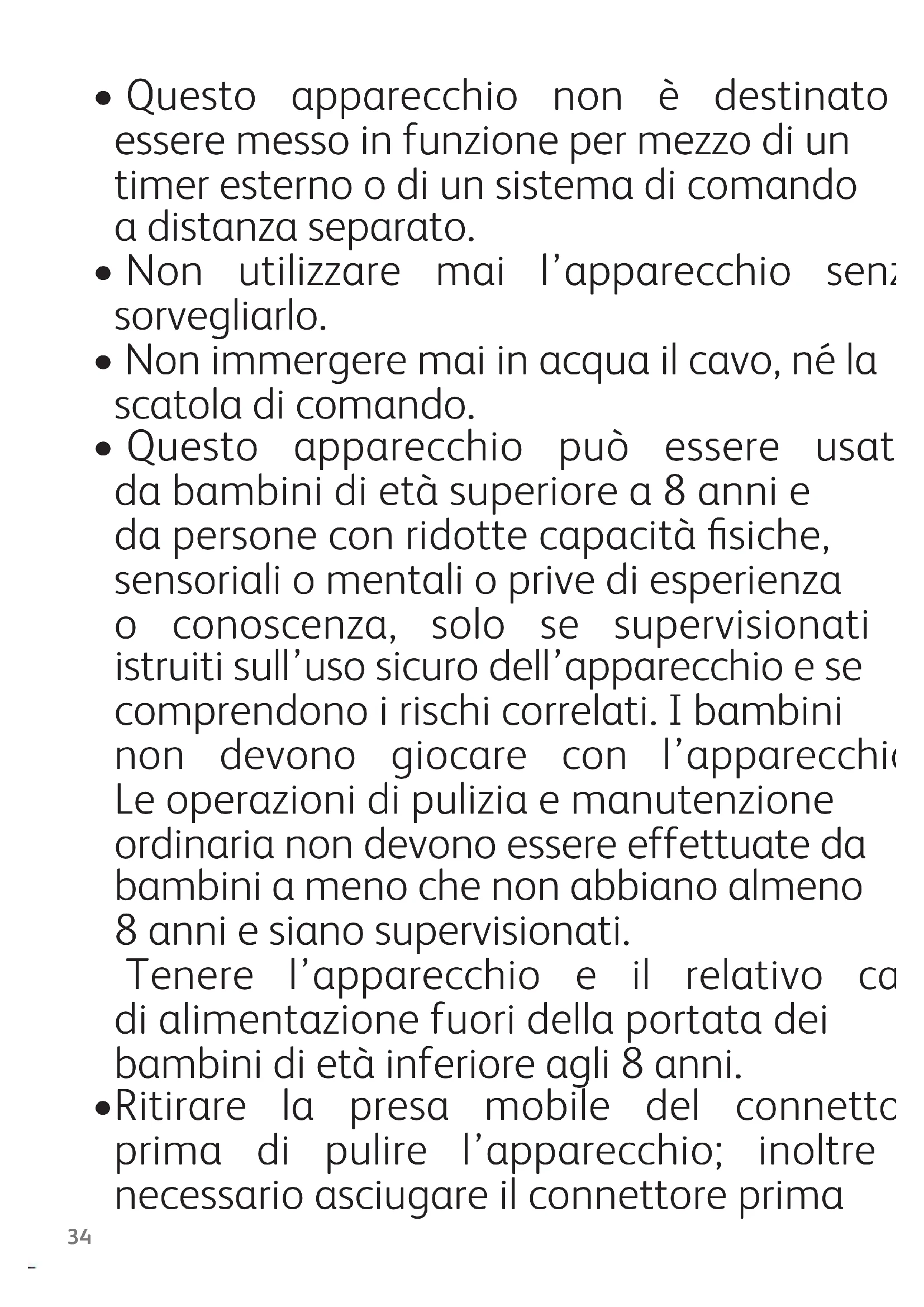 - Questo apparecchio può essere usato dabambinidietàsuperiorea8annie dapersoneconridottecapacitàsiche, sensorialiomentalioprivediesperienza o conoscenza, solo se supervisionati o istruitisull’usosicurodell’apparecchioese comprendonoirischicorrelati.Ibambini non devono giocare con l’apparecchio. Leoperazionidipuliziaemanutenzione ordinarianondevonoessereeffettuateda bambiniamenochenonabbianoalmeno 8anniesianosupervisionati. Tenere l’apparecchio e il relativo cavo dialimentazionefuoridellaportatadei bambinidietàinferioreagli8anni.